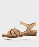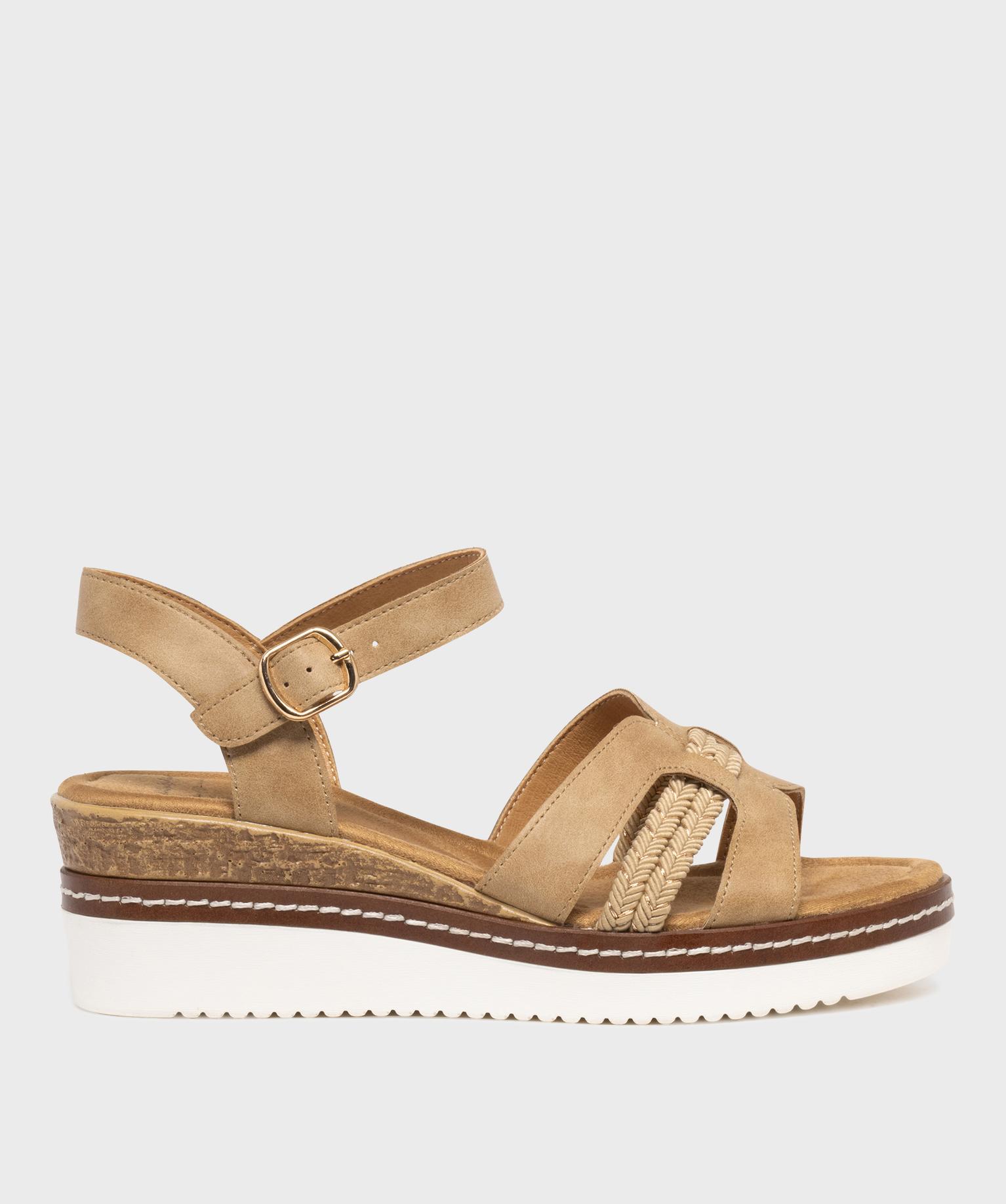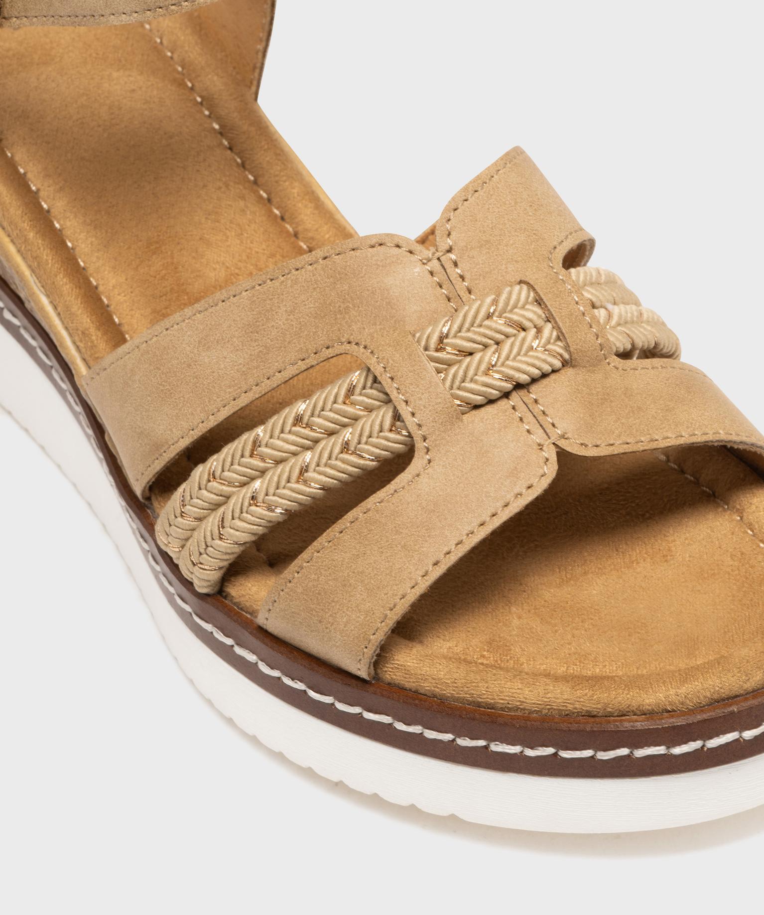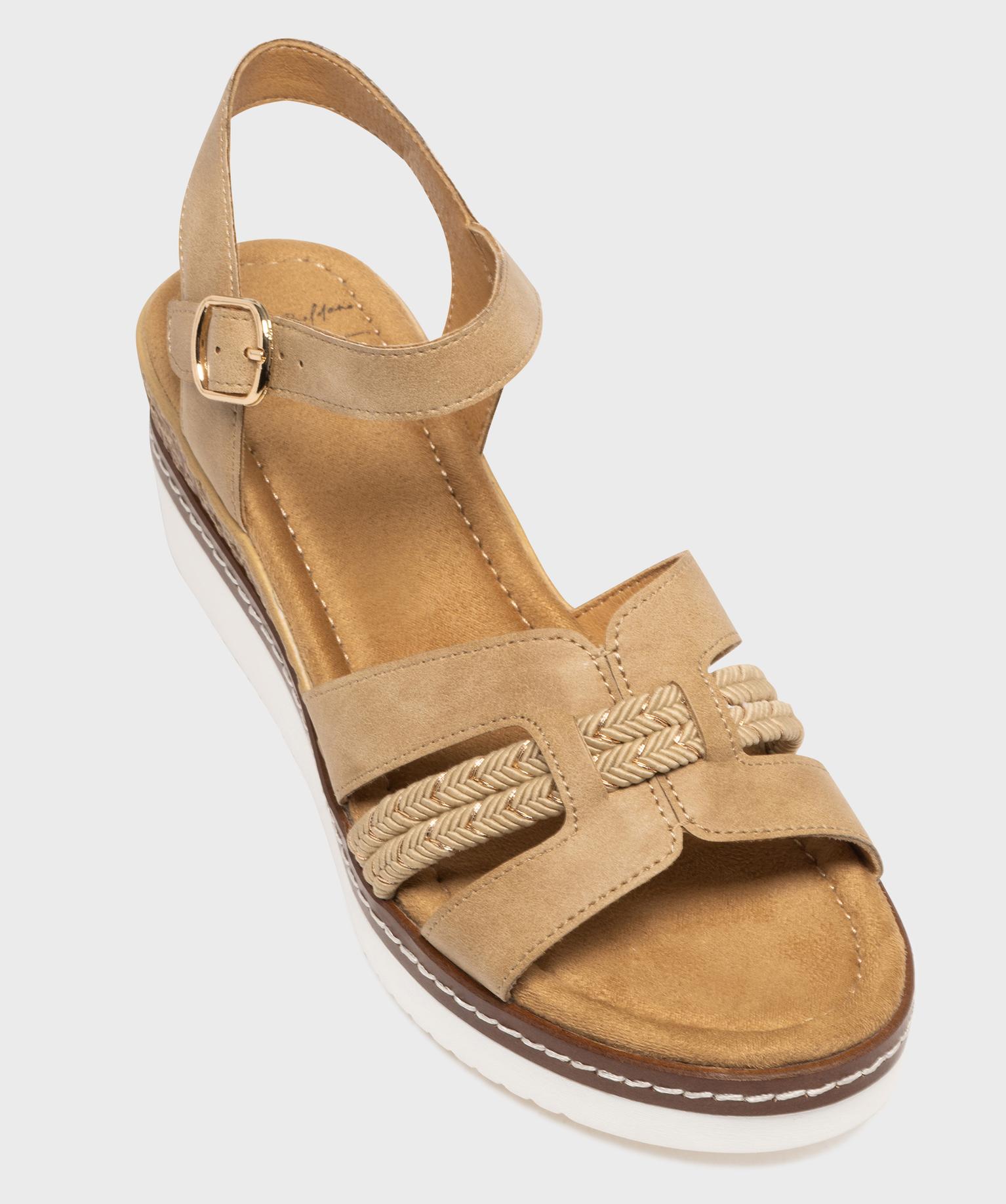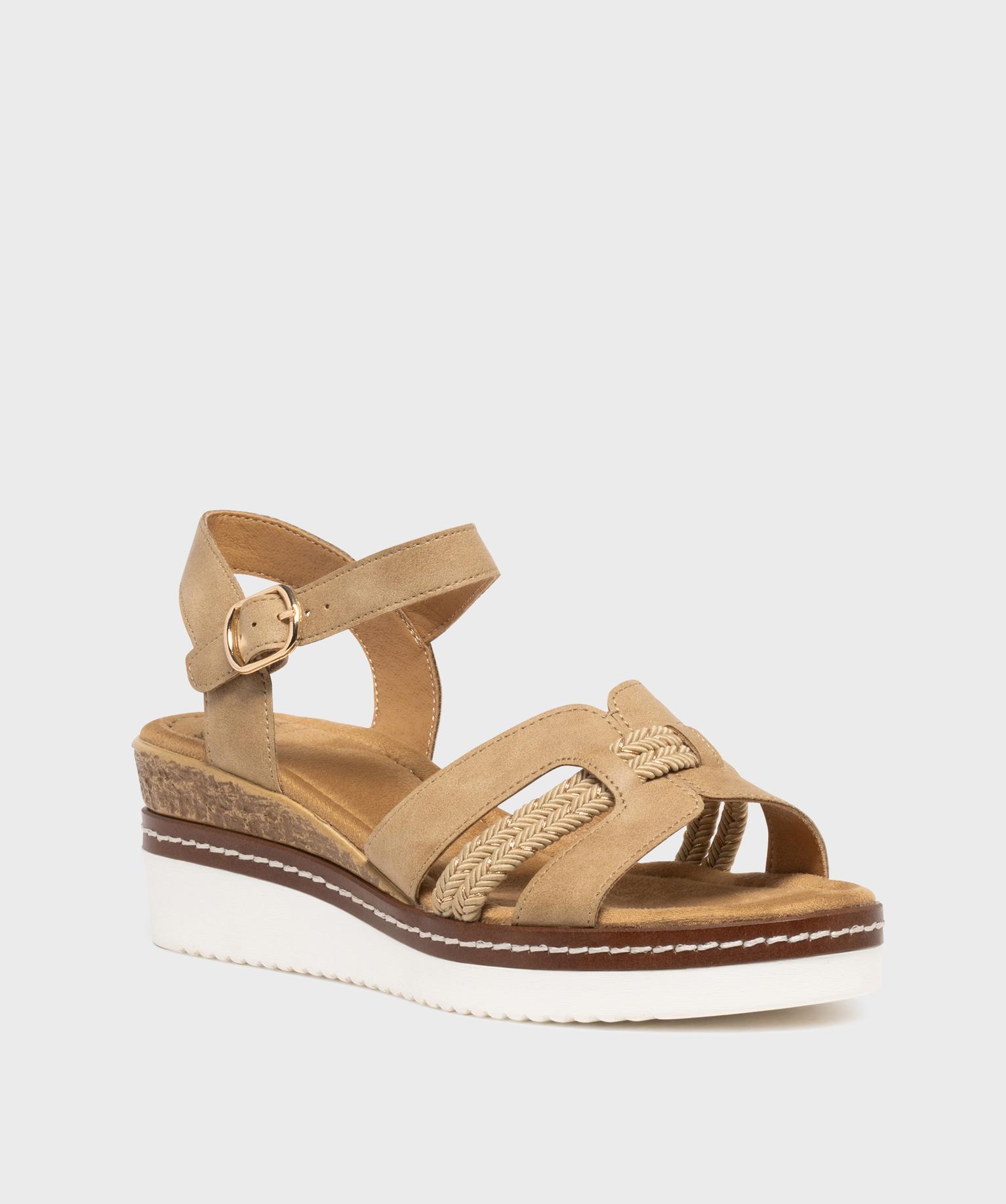Ces sandales à talon compensé pour femme allient allure estivale, style et confort. Leur semelle joue sur les contrastes de matières et de couleurs pour un style décontracté et chic. Le pied est maintenu par une bride à la cheville et un jeu de brides graphiques à l’avant, mêlant effet lisse, tressé et touches de lurex brillant. La semelle intérieure est en tissu doux.