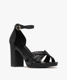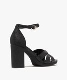 Élégantes et glamour, ces sandales femme accompagneront vos plus belles robes de soirée comme vos ensembles chics du quotidien. Montées sur un large talon recouvert de 8,5 cm, elles affichent une belle hauteur pour affiner la jambe, tout en assurant votre stabilité. La tige est composée de 3 brides grainées et brillantes à l'avant et d'un talon fermée et pailletée ! Ces sandales à talon se ferment à l'aide d'une bride à boucle haut sur la cheville. De quoi mettre le pied à l'honneur ! Petit patin à l'avant-pied (1,5 cm). Semelle intérieure moelleuse. Élastique d'aisance sous boucle.