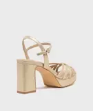 Ces sandales femme à talon puisent leur inspiration dans le glamour des années disco. Avec leur talon haut et large de 9 cm, compensé par un patin de 2,5 cm, ces nu-pieds allongent la silhouette tout en restant stables et confortables. Le pied est délicatement maintenu par une fine bride à la cheville et un jeu de brides fines entrelacées à l’avant. Le bout ouvert carré met le pied en valeur. Dorées et éblouissantes jusqu'au talon, ces époustouflantes sandales captent la lumière et twistent toutes vos tenues : du jean slim à la petite robe noire sexy ! La semelle intérieure moelleuse assure votre confort. Des chaussures ouvertes à talon idéales pour danser jusqu’au bout de la nuit ou sublimer une tenue de fête.