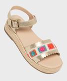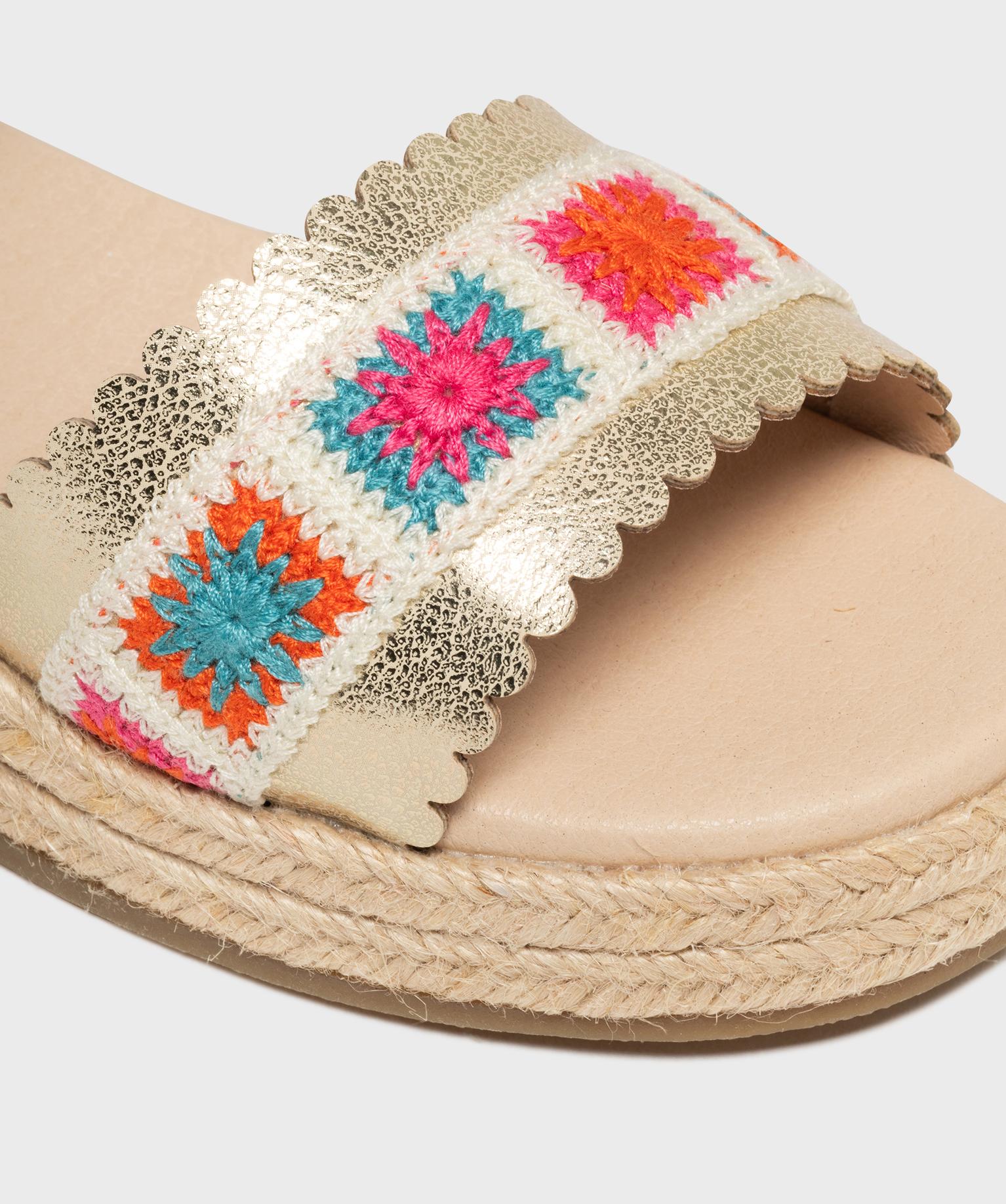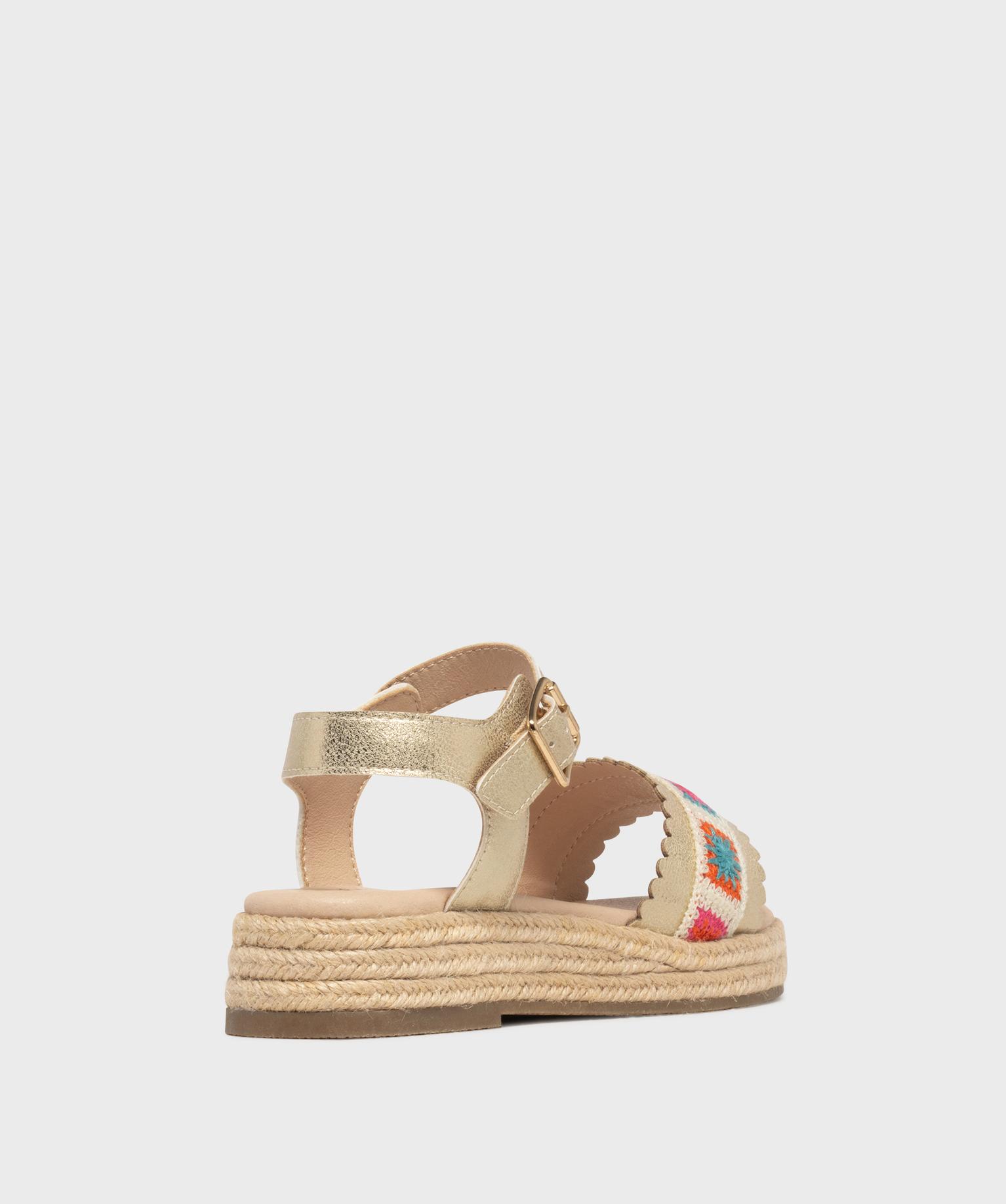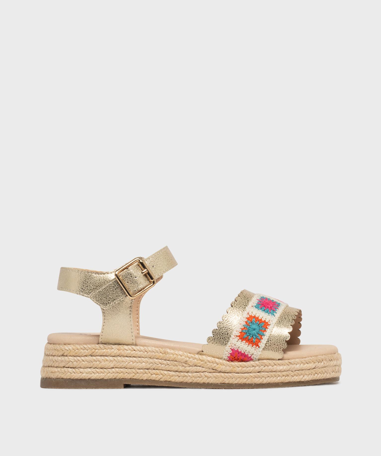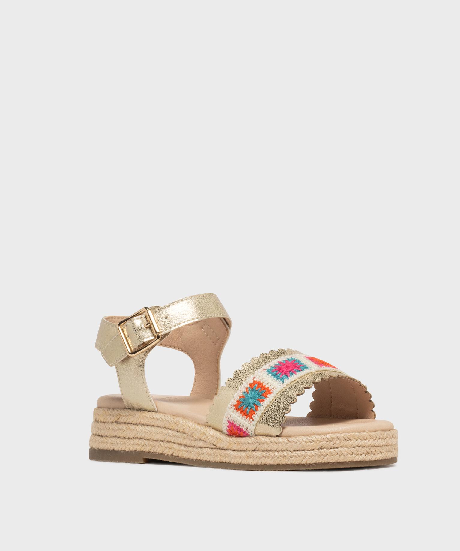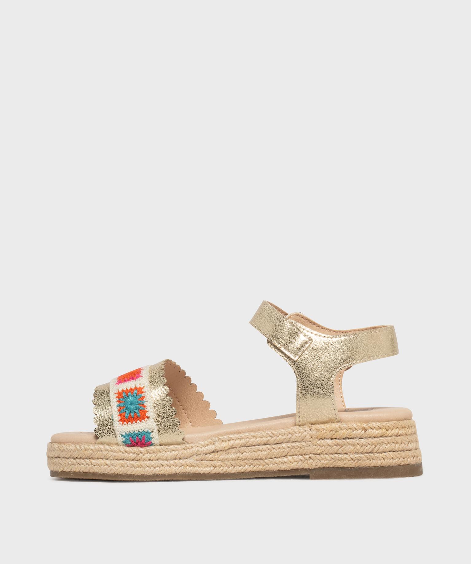Ces sandales compensées vont devenir les meilleures alliées de l’été de votre fille. Leur semelle intermédiaire recouverte de corde apporte une touche espadrille ensoleillée, parfaite pour les beaux jours. Le dessus dévoile une large bride festonnée dorée et craquelée, sublimée par une bande granny crochet multicolore. La bande de tissu donne à ces sandales fille un esprit artisanal et joyeux. La bride cheville est réglable par boucle. Craquez pour ces sandales pleines de charme, idéales pour réveiller une robe légère ou un short en jean.