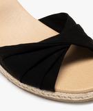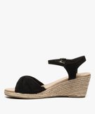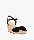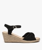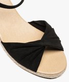 Ces sandales femme élégantes et discrètes mettront votre silhouette en valeur cet été. Grâce à leur talon compensé de 7 cm, entièrement recouvert de corde, ces chaussures ouvertes apporteront une touche rétro à vos tenues estivales. La tige est en tissu avec un joli mouvement drapé sur l'avant du pied. Il ne vous reste plus qu'à choisir la couleur que vous préférez : uni, sombre, acidulée ou imprimée, cette sandale est déclinée dans de nombreuses finitions. Pourquoi ne pas jouer le jeu jusqu’au bout, en les associant à un short taille haute, un top à épaules dénudées et une grande capeline ? succès assuré ! Fermeture fine bride à boucle sur le côté du pied.