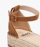 Inspirées des espadrilles, ces sandales à talon compensé offrent un confort incroyable et une touche bohème à vos tenues d'été. Le dessus uni en suédine ouvert à l'avant et à l'arrière fermé. Ces sandales avec bride cheville s'ajustent à l'aide d'une boucle ton sur ton. Avec une jupe en jean et un top fluide, une robe bustier ou une tenue à motifs, ces nu-pieds pour femme se portent avec tous les styles.
