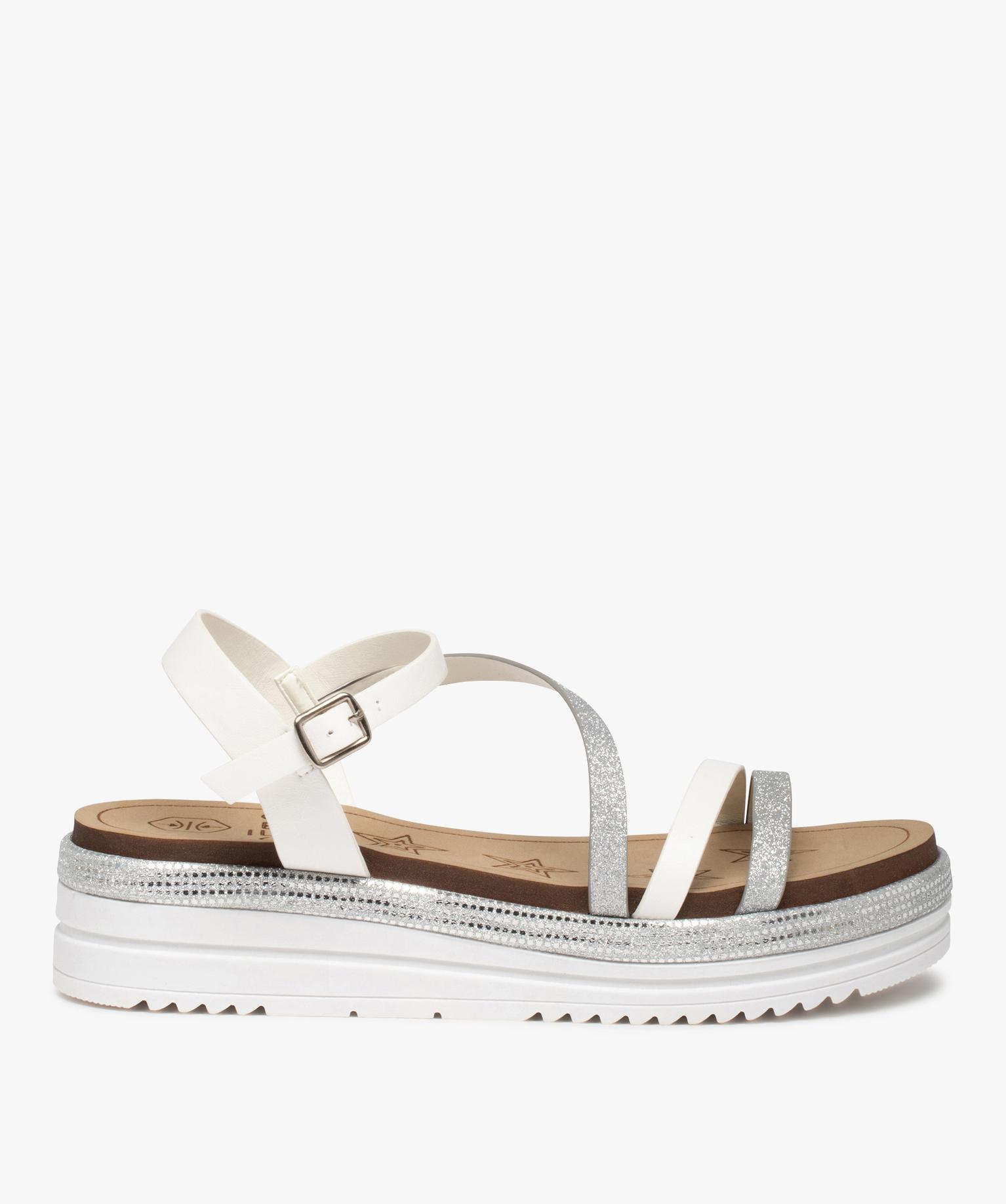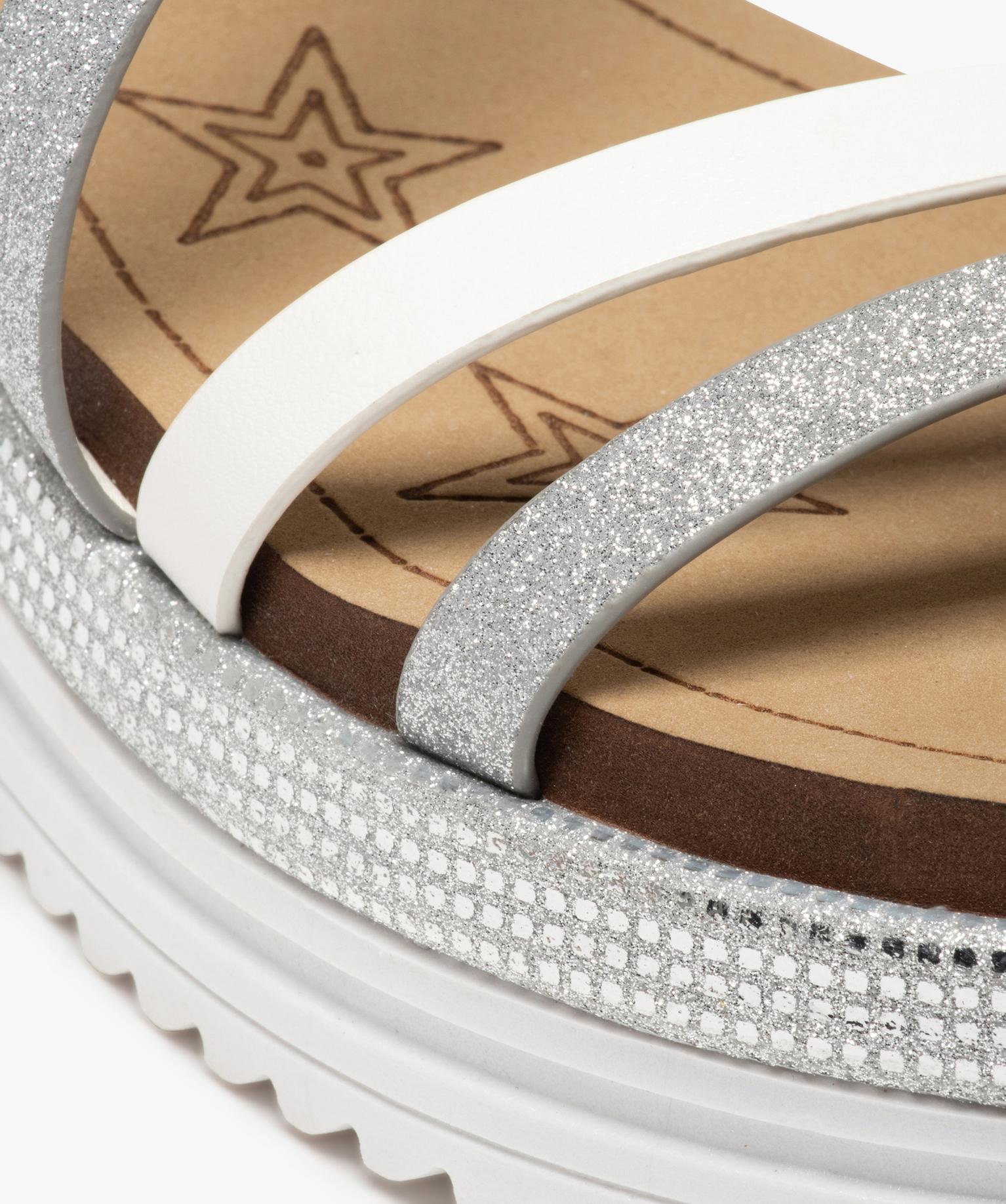 Ces sandales fille s’inscrivent pile dans les tendances de la saison ! La tige est composée de fines brides unies ou pailletées qui découvrent joliment le pied. La semelle plateforme associe une partie en élastomère finement crantée et un liseré recouvert de matière pailletée. Des sandales compensées de 4,5 cm au talon, une hauteur qui reste facile à porter au quotidien. Ces nu-pieds pailletés mettront en lumière les tenues des filles. L’idéal ? Avec un mini short en jean et un tee-shirt coloré. Fermeture bride à boucle sur le côté du pied.