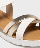 Ces sandales femme à semelle crantée sportswear et petit talon compensé allient modernité et confort. Leur semelle intérieure moelleuse assure une agréable sensation lors de la marche. Les nu-pieds Valentina Baldano présentent trois brides croisées à l'avant, composées de matières variées : grainée, métallisée et pailletée pour un subtil jeu de textures. La bride à la cheville, dotée d’une boucle dorée, permet un ajustement parfait. Élégantes et fonctionnelles, ces sandales plates s'adaptent à toutes les occasions. Détail texturé brillant au talon.