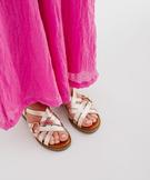 Ces jolies sandales à brides métallisées ajouteront une touche d’éclat à toutes les tenues estivales. Les brides entrecroisées sur l’avant, surmontées d’un anneau métallique, subliment le pied tout en assurant un parfait maintien, tandis que la bride arrière, maintenue par des pattes latérales, s’ajuste à l’aide d’une boucle dissimulant un élastique. Ces sandales femme signées Follow Me possèdent une semelle intérieure moussée et reposent sur une semelle fine avec talon extra plat. Elles se portent avec une robe fleurie comme avec un short en jean.