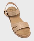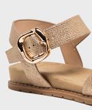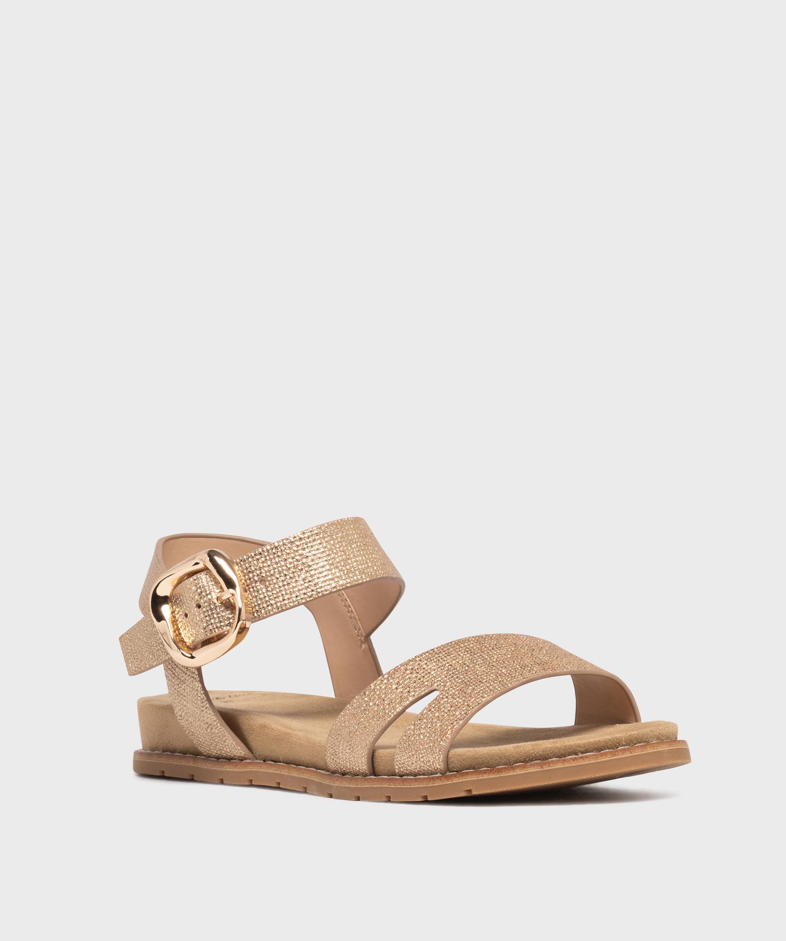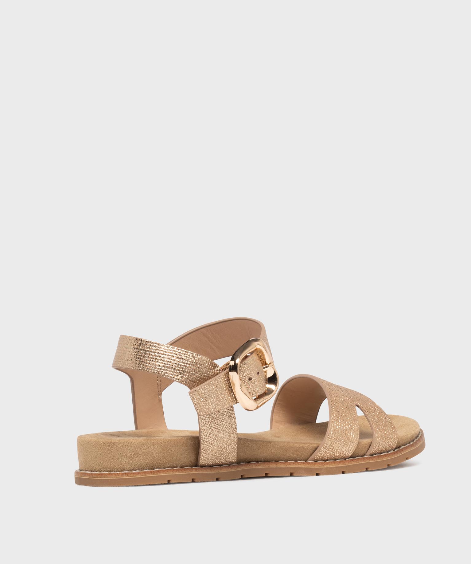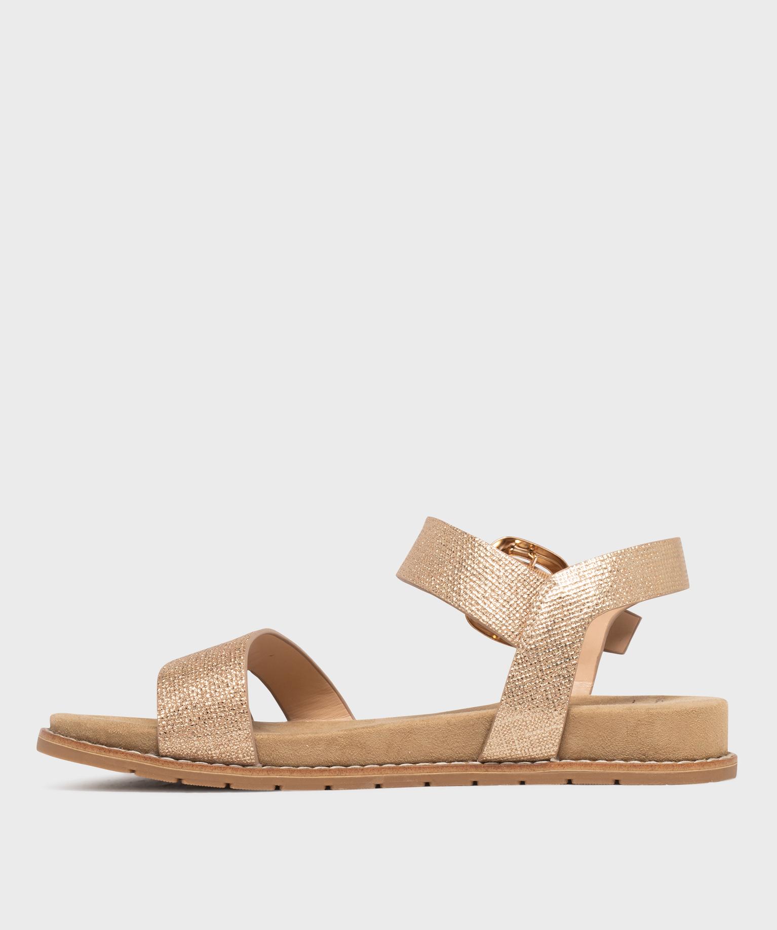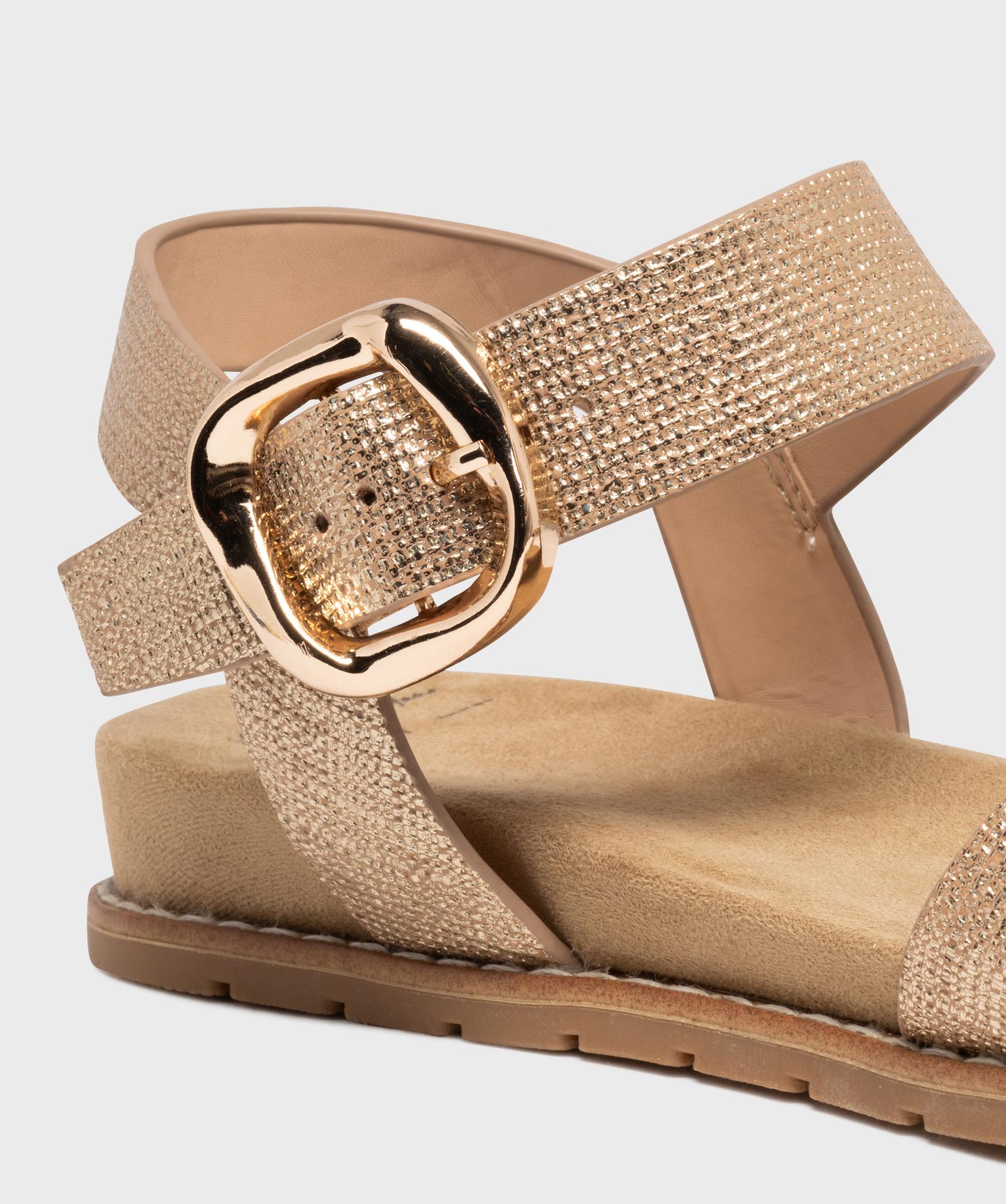 Ces sandales métallisées Valentina Baldano sont de véritables bijoux pour vos pieds ! Des sandales femme conçues dans une matière texturée qui accroche la lumière, fermée par une imposante boucle dorée. Une large bride sur l’avant et une autre autour de la cheville avec élastique sous la boucle, assurent un maximum de confort. Ces sandales plates possèdent une semelle intérieure moelleuse en suédine et un petit talon compensé offrant une marche confortable. Semelle 1,5 cm.