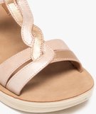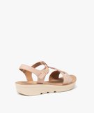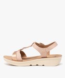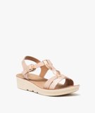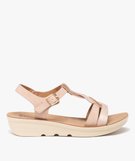 Discrètement brillantes, ces sandales femme vont illuminer toutes vos tenues estivales sans en faire trop. On adore l'inspiration salomé incarnée par l'entrelac de brides en T sur le coup de pied. Super confortables, ces nu-pieds sont légers, souples et montés sur un talon compensé de 3,5 cm avec patin avant de 2 cm pour une bonne stabilité. Des sandales faciles à ajuster au niveau de la cheville grâce à une boucle.