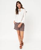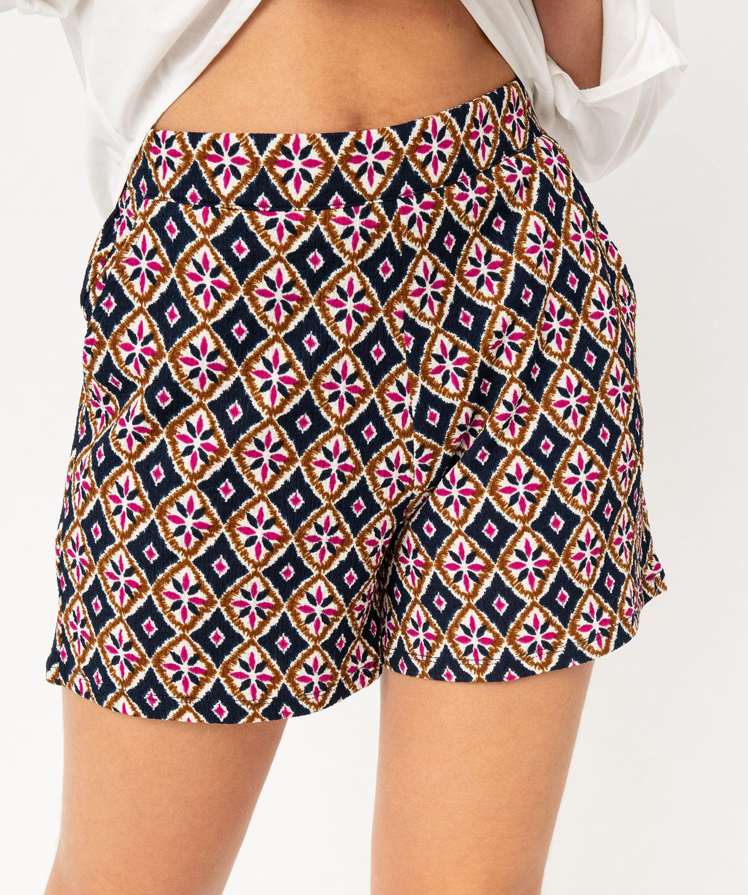 Short pour femme à taille haute et coupe ample, agréable à porter même par fortes chaleurs. Ce short extensible très confortable est entièrement imprimé d'un motif graphique multicolore. Il est équipé d'une taille élastiquée sur l'arrière et de 2 poches italiennes. À l'avant, la ceinture est plate pour assurer un tomber impeccable. Vous pourrez mettre en valeur ce short en le portant avec un tee-shirt blanc des sandales à brides.