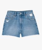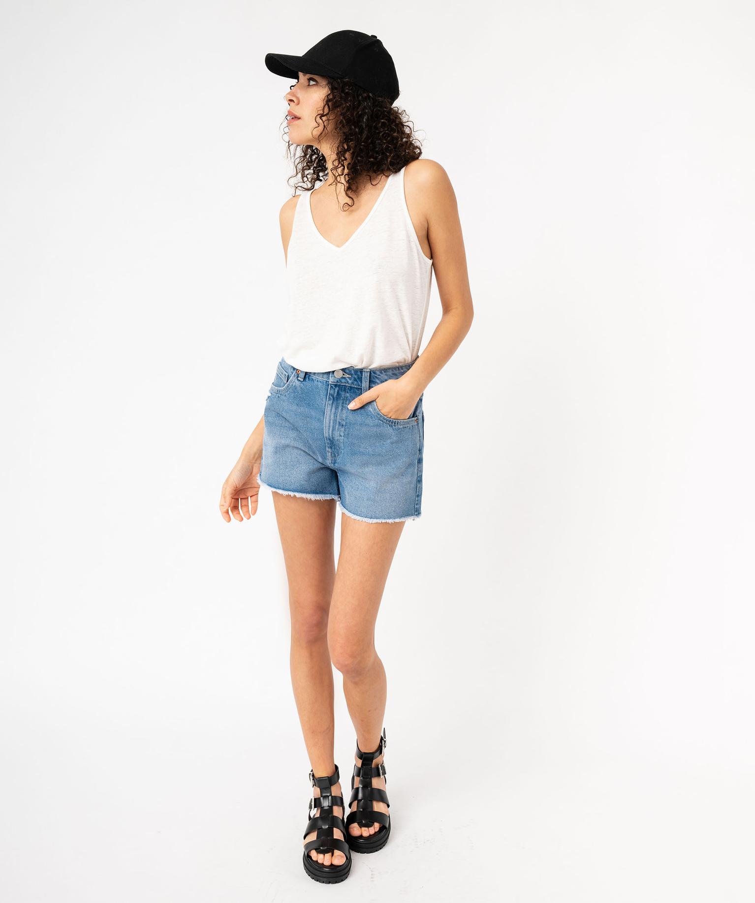 Allure ultra cool assurée avec ce short en jean au coloris délavé avec marques d’usures et finitions franges en bas de jambes. Un short femme confortable et stylé qui vous accompagnera tout l’été lors de tous vos moments décontractés. Un short à franges à porter avec un débardeur et des santiags pour un look rock ou avec une chemise nouée et des sandales pour une allure glamour rétro. Trois poches rivetées sur l’avant et deux poches plaquées au dos. Fermeture par zip et bouton.