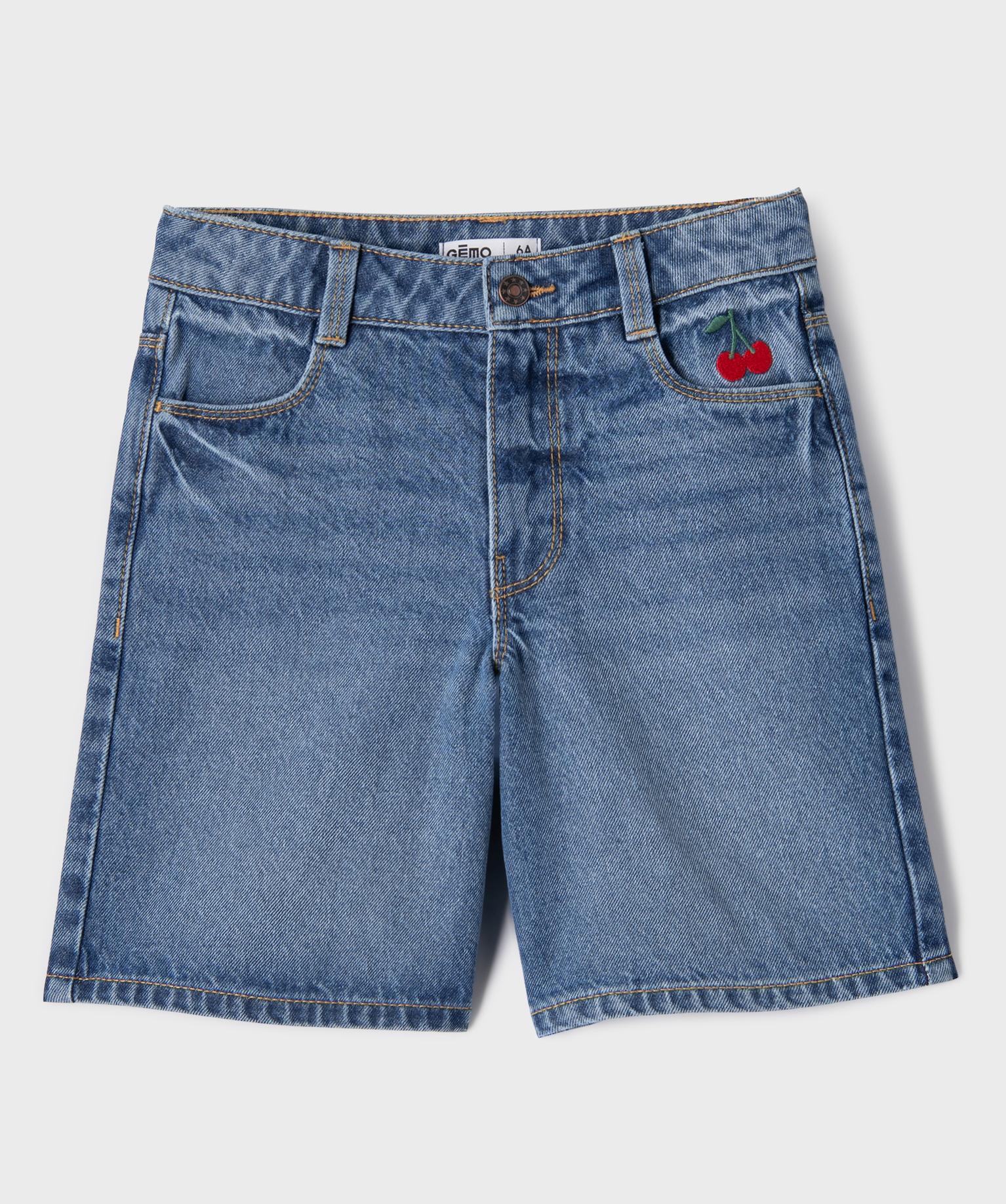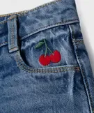 Ce short en jean, orné de cerises brodées sur la hanche, apportera une note gourmande et girly dans le vestiaire denim des filles. Son délavage accentué sur les zones d’usure lui confère une allure décontractée, idéale pour toutes les escapades estivales. Ce short fille possède une taille ajustable par élastique intérieur et se ferme à l’aide d’un zip et d’un bouton. Un short long à porter comme un bermuda ou avec des revers pour un look encore plus cool !