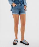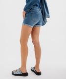 Essentiel du vestiaire estival, le short en jean assure un look décontracté en toutes circonstances. Ce short femme séduit par son coloris légèrement délavé, ses revers cousus en bas de jambe et ses surpiqûres contrastantes. Fidèle aux codes du denim, il possède trois poches rivetées sur l’avant et deux poches plaquées au dos, et se ferme par zip et bouton. Un short à revers à porter tout l’été avec une chemise nouée ou un tee-shirt.