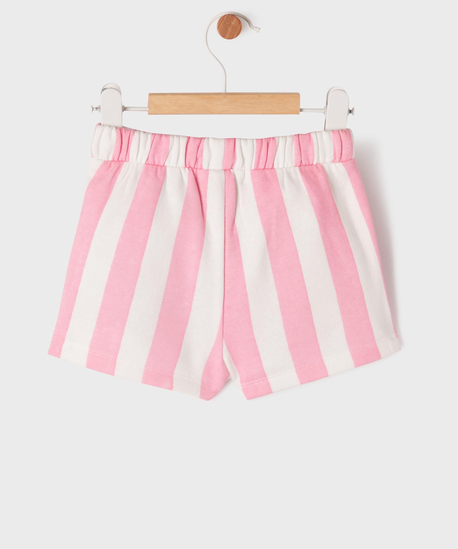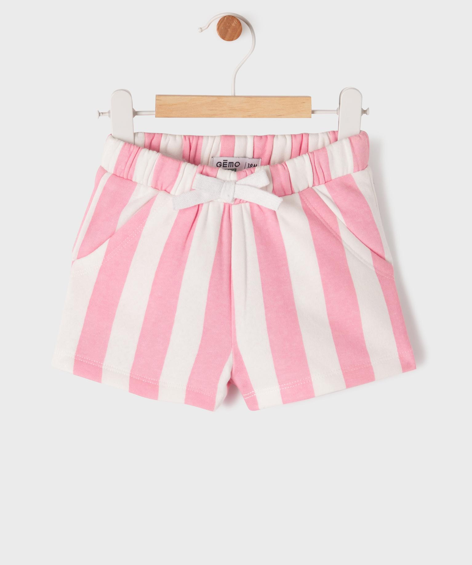 Ce short en molleton à rayures est idéal pour offrir confort et douceur aux petites filles. Confectionné dans une matière moelleuse et agréable à porter, avec intérieur molletonné, il assure confort et chaleur. Sa coupe confortable et sa taille élastiquée ajustable facilitent l’enfilage et offre une grande liberté de mouvement tout au long de la journée. Les rayures aux couleurs gourmandes et le petit noeud à la taille apportent une touche charmante et ludique, parfaite pour composer des tenues estivales. Facile à assortir, ce short bébé fille se porte aussi bien avec un tee-shirt qu’avec un petit sweat pour un look décontracté et confortable. Deux poches latérales.