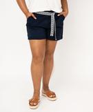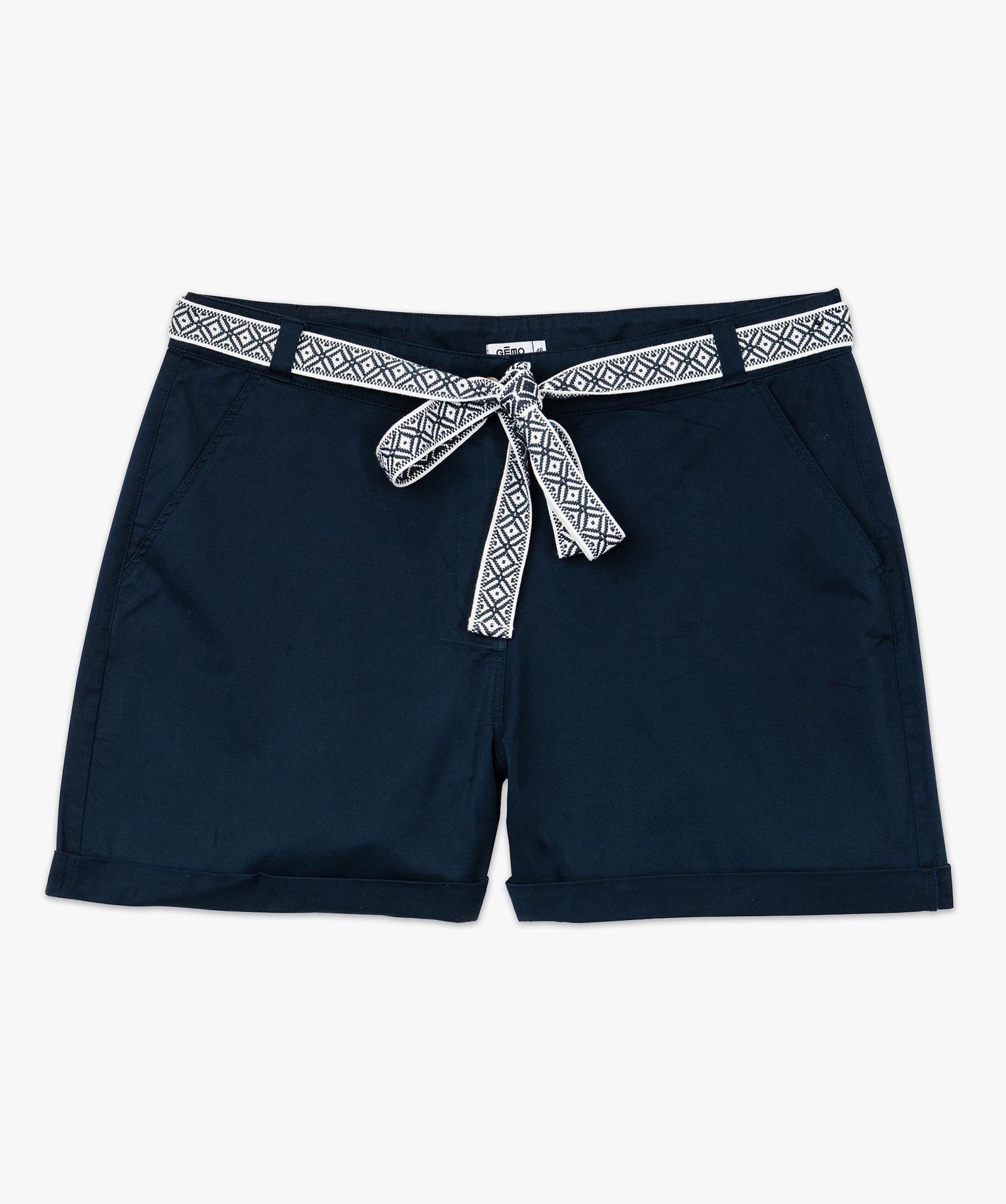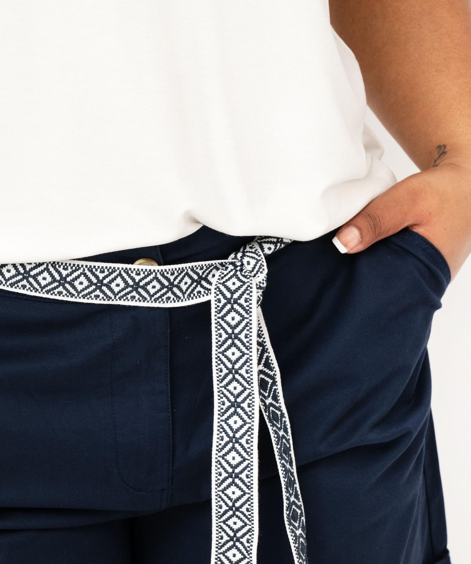 Confortable et élégant, le short en toile fait partie des pièces phare du dressing estival. Confectionné en coton extensible, ce short femme grande taille (du 46 au 54) offre un tomber impeccable et beaucoup de confort. Il arbore une coupe ample avec deux poches italiennes et deux fausses poches raglan au dos. La taille de ce short est mise en valeur grâce à une jolie ceinture tressée à motifs d’inspiration ethnique. Un short à porter avec un tee-shirt et des baskets pour un look décontracté ou avec une chemise et des sandales pour un look plus élégant.