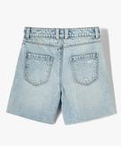 Gémo présente une version atypique du short en jean. Un short fille qui se distingue par sa coupe longue qui pourrait presque le faire passer pour un bermuda. Il affiche un coloris très délavé avec marques d’usure au niveau des poches et des finitions bord-franc dans le bas. Trois poches sur l’avant et deux poches plaquées au dos. Fermeture par zip et bouton.