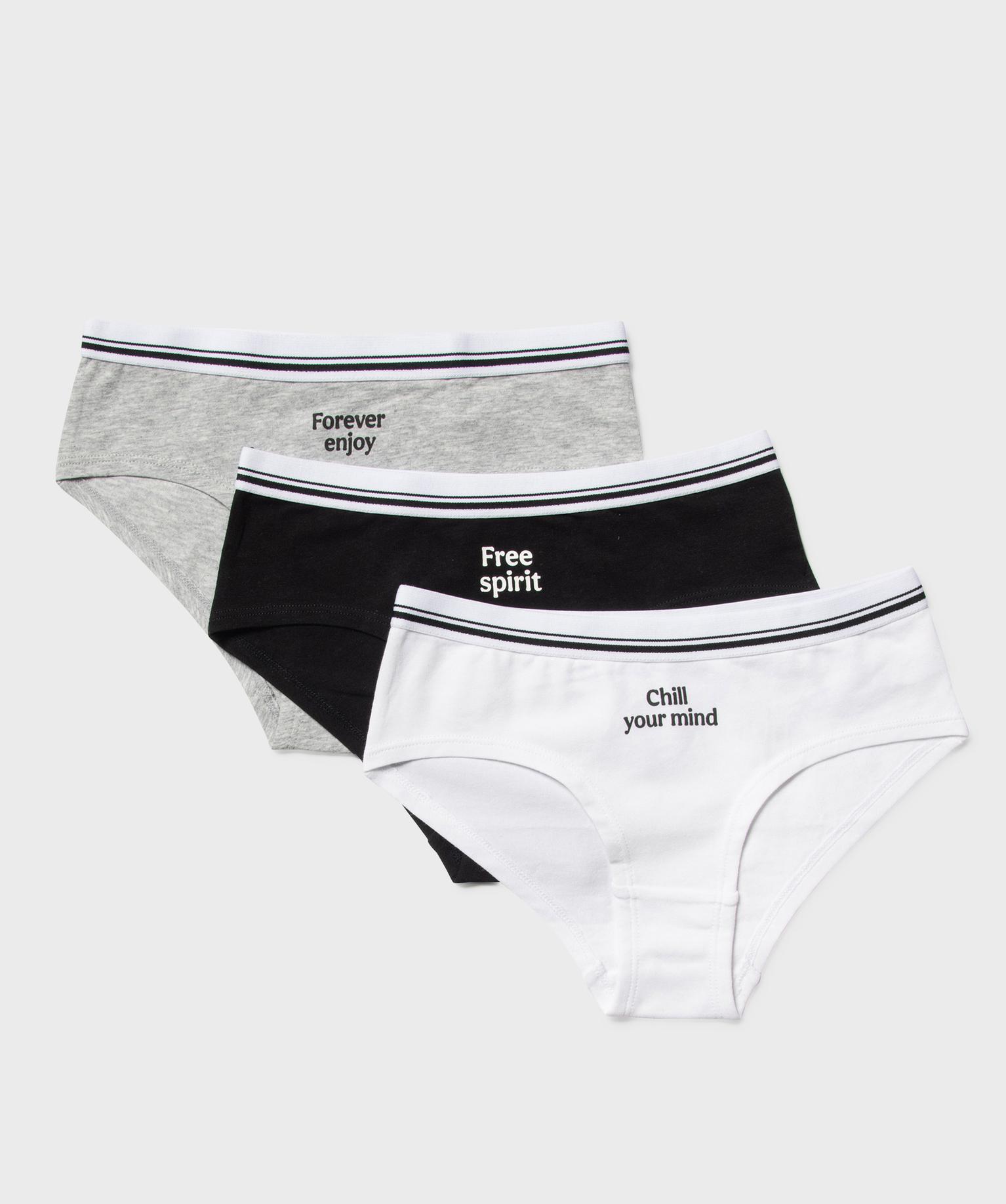 Ce lot de 3 shorties a été spécialement pensé pour les ados. Ces shorties fille, aux couleurs neutres et intemporelles, sont ornés d’inscriptions sur l’avant, ajoutant une touche de fantaisie. Ils sont dotés d’un large élastique doux à la taille. Des shorties en coton stretch, inspirés de l’esprit sportswear, aussi élégants que confortables. Ils sont livrés dans une pochette en carton.