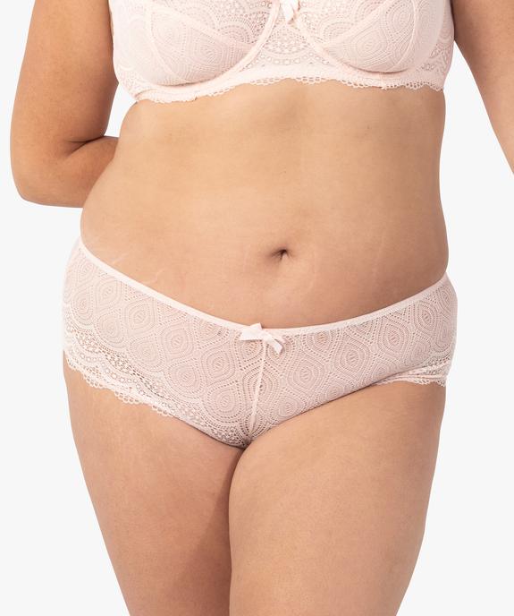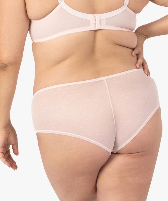 Un joli shorty conçu dans un mélange de matières douces pour un résultat ultra féminin. Fine dentelle sur l’avant et tulle transparent orné de plumetis sur l’arrière, voilà vos courbes mises en valeur ! Ce shorty femme grande taille (du 46/48 au 58/60) passera pratiquement inaperçu sous vos vêtements les plus ajustés grâce à des coutures plates non élastiquées sur l’arrière. Un shorty en dentelle à porter avec le soutien-gorge assorti.