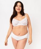 Un soutien-gorge en dentelle spécialement créé pour assurer un bon maintien aux poitrines généreuses. Avec ses armatures, son entre-bonnet haut, ses bretelles confortables et son large tour de buste, il offre beaucoup de confort. Un soutien-gorge grande taille (du 105D au 115F) avec des bonnets non coqués pour une silhouette naturelle. Un soutien-gorge emboitant à armatures conçu dans une association de dentelle et de tulle à motifs plumetis, avec de jolies finitions dentelées. Pour une silhouette harmonieuse, vous le porterez avec le shorty assorti.