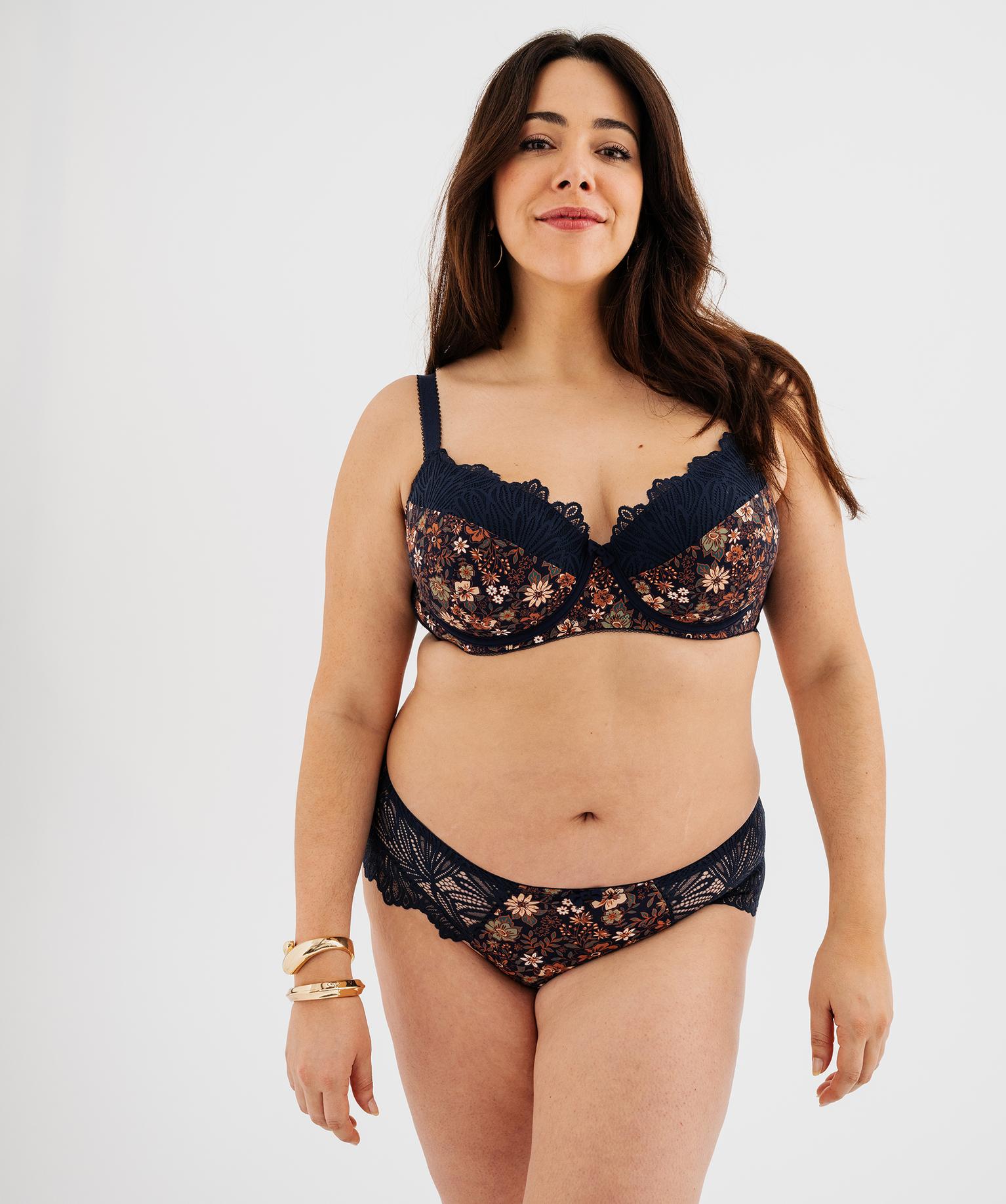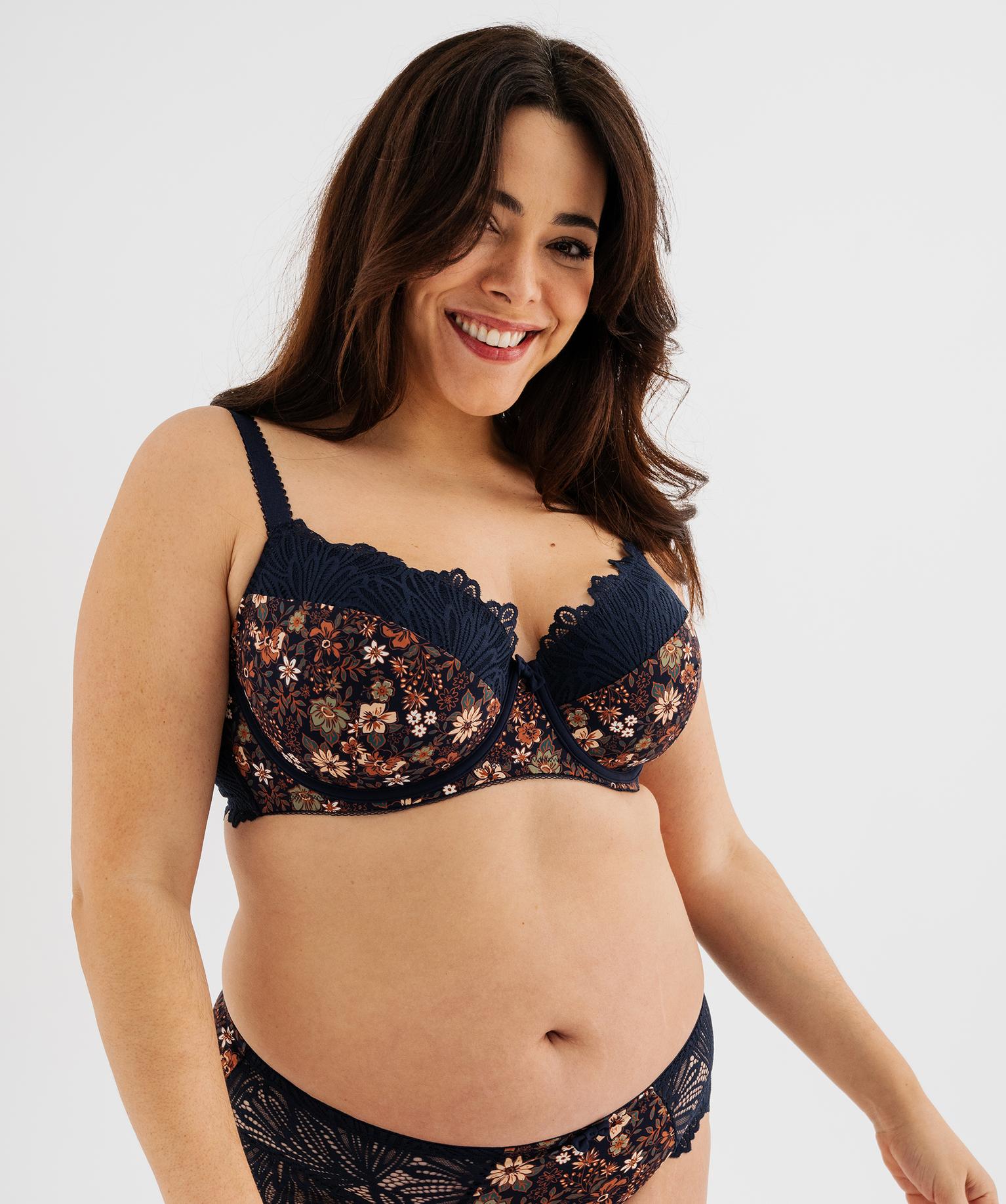 Ce soutien-gorge emboitant a été spécialement pensé pour sublimer les poitrines généreuses tout en assurant un excellent maintien. Un soutien-gorge grande taille (du 100D au 115F) confectionné dans une alliance de microfibre à motifs fleuris et de dentelle, doté de larges bretelles aux finitions festonnées. Ce soutien-gorge à armatures avec large tour de buste assure un maximum de confort sous tous les vêtements. Il se porte avec la culotte assorti.