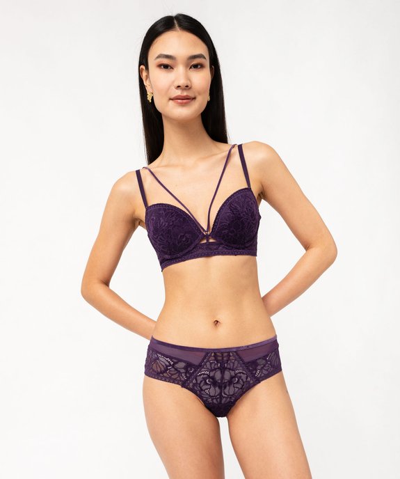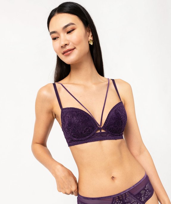Sublimez votre décolleté grâce à ce soutien-gorge push-up qui permet de gagner une taille de bonnet. Un modèle glamour agrémenté de fines bandelettes de velours élastiques, fixées sur un anneau métallique à l’entre-bonnet et qui se prolongent sur les épaules. Ce soutien-gorge à armatures confectionné en dentelle qui affiche une jolie transparence autour du buste. Un modèle à porter avec la culotte ou le shorty assorti.