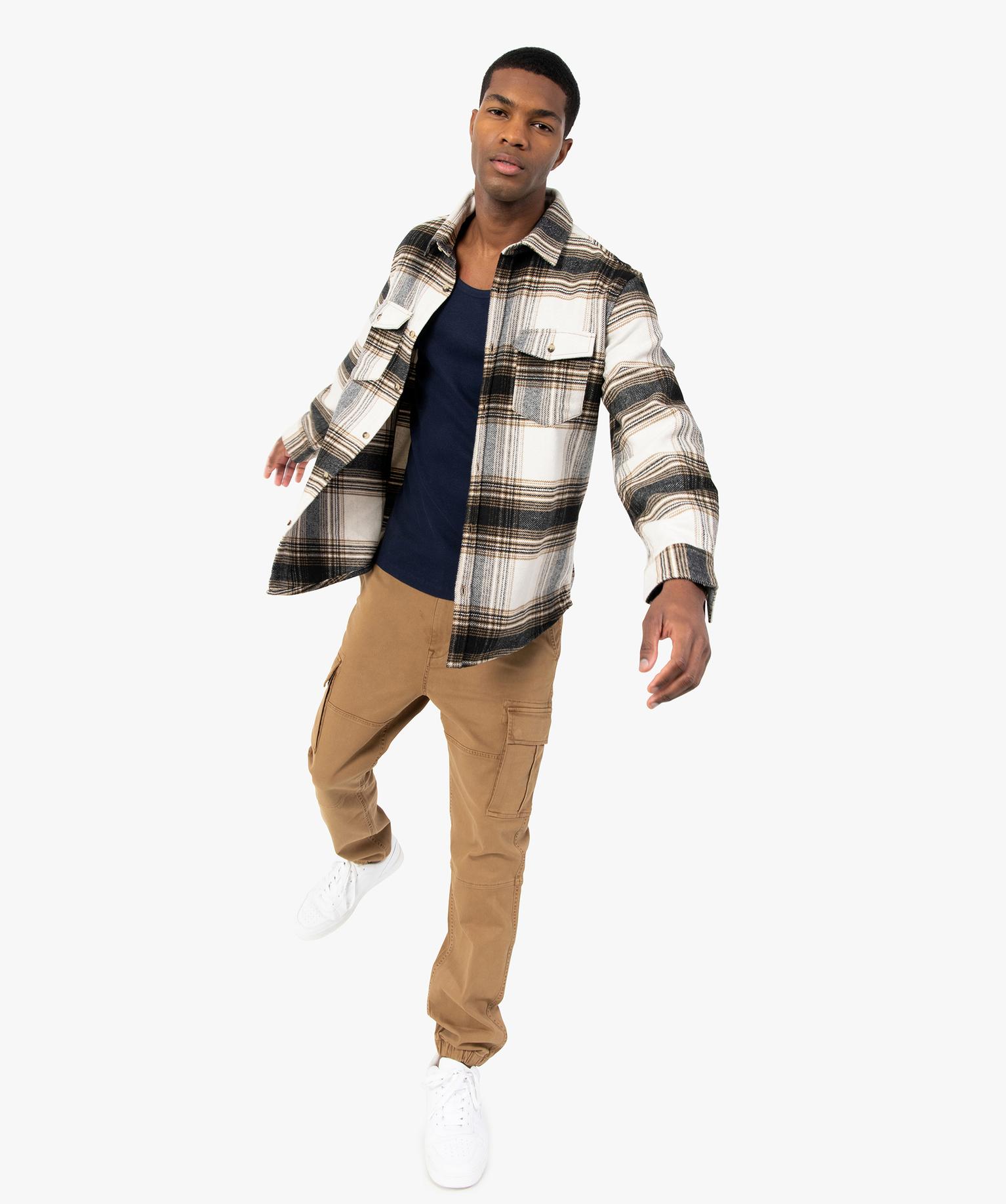 Must-have de la saison, la surchemise à carreaux s’affiche dans une version épaisse et chaude pour réchauffer tous les looks des hommes. Une chemise épaisse à l’allure vintage inspirée du vestiaire des années 70. Cette surchemise pour homme possède une coupe droite, deux poches poitrine à rabat boutonné et se ferme par boutons sur l’avant et aux poignets. Elle se porte ouverte sur un tee-shirt uni avec un jean et une paire de boots.