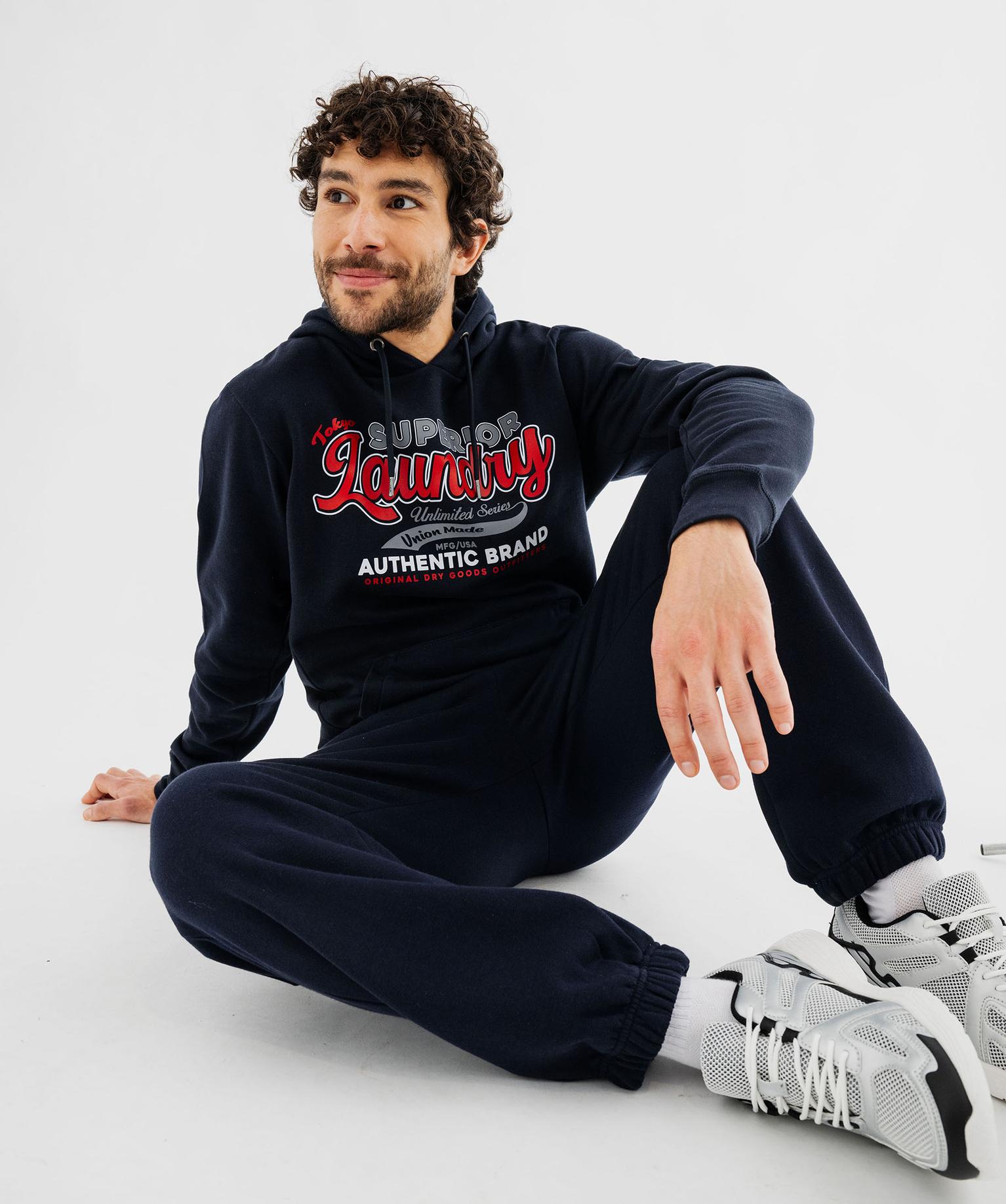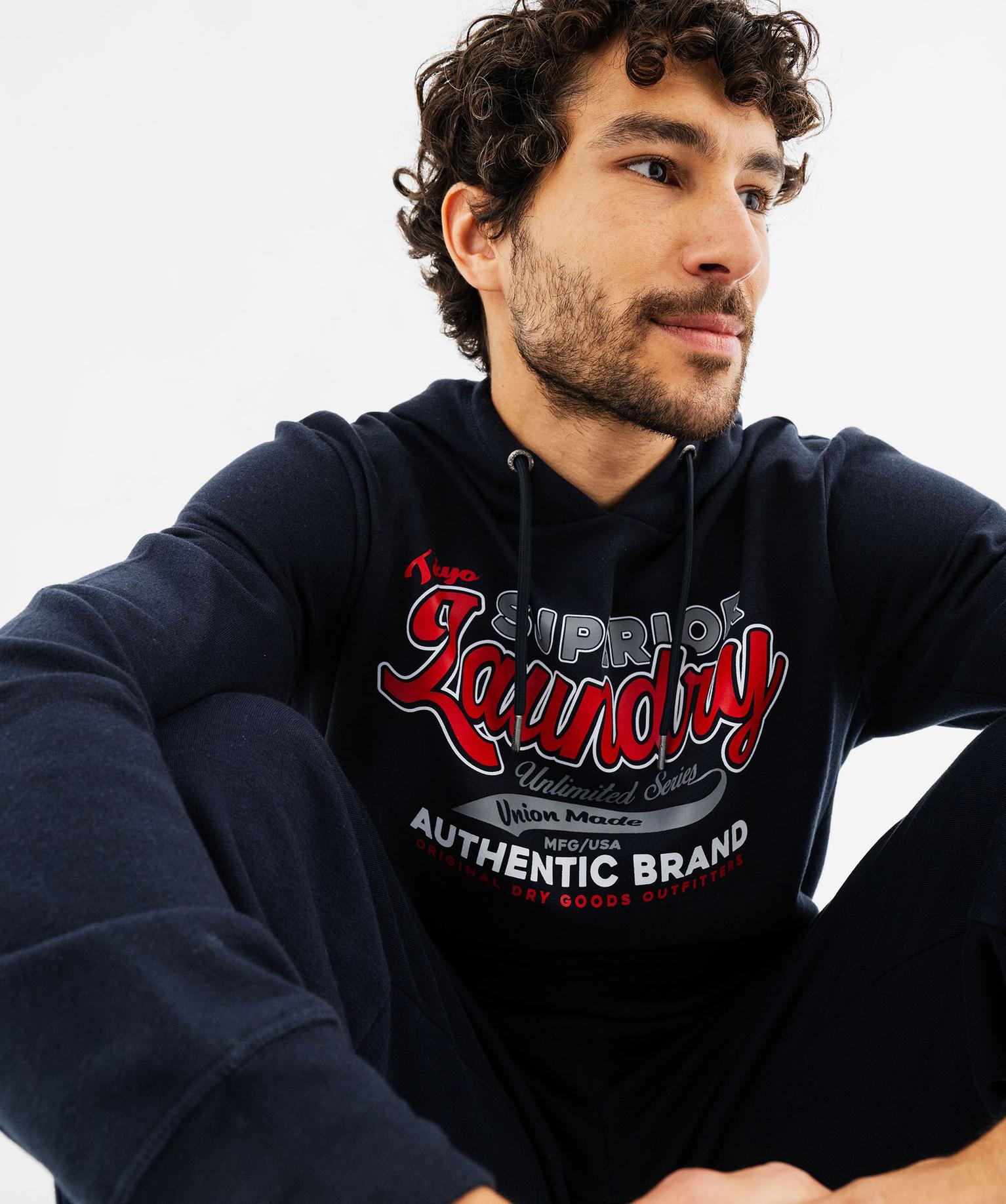 Tokyo Laundry, la marque connue pour son mélange unique d’influences britanniques et vintage américaines, propose ici un sweat pour homme au look original. Un sweat fidèle aux codes de l’univers sportswear avec intérieur molletonné, capuche doublée jersey et grande poche kangourou. Reconnaissable d’un seul coup d’oeil, il arbore une large inscription signature sur le buste et un petit logo brodé dans le bas. Un sweat à capuche à porter aussi bien avec un pantalon de jogging qu’avec un jean ou un pantalon baggy pour alterner style sportsweat et streetwear. Dos uni. Finitions en bord-côte.