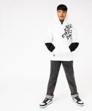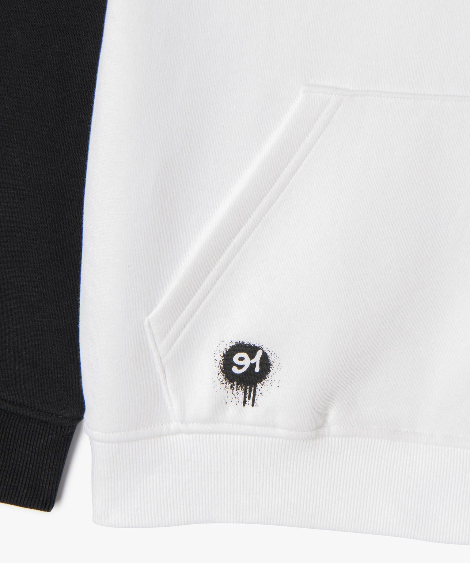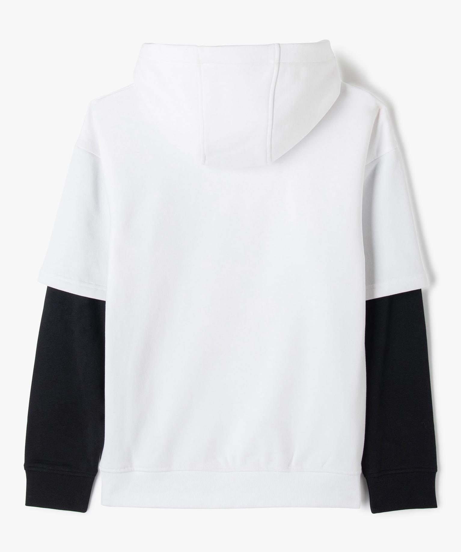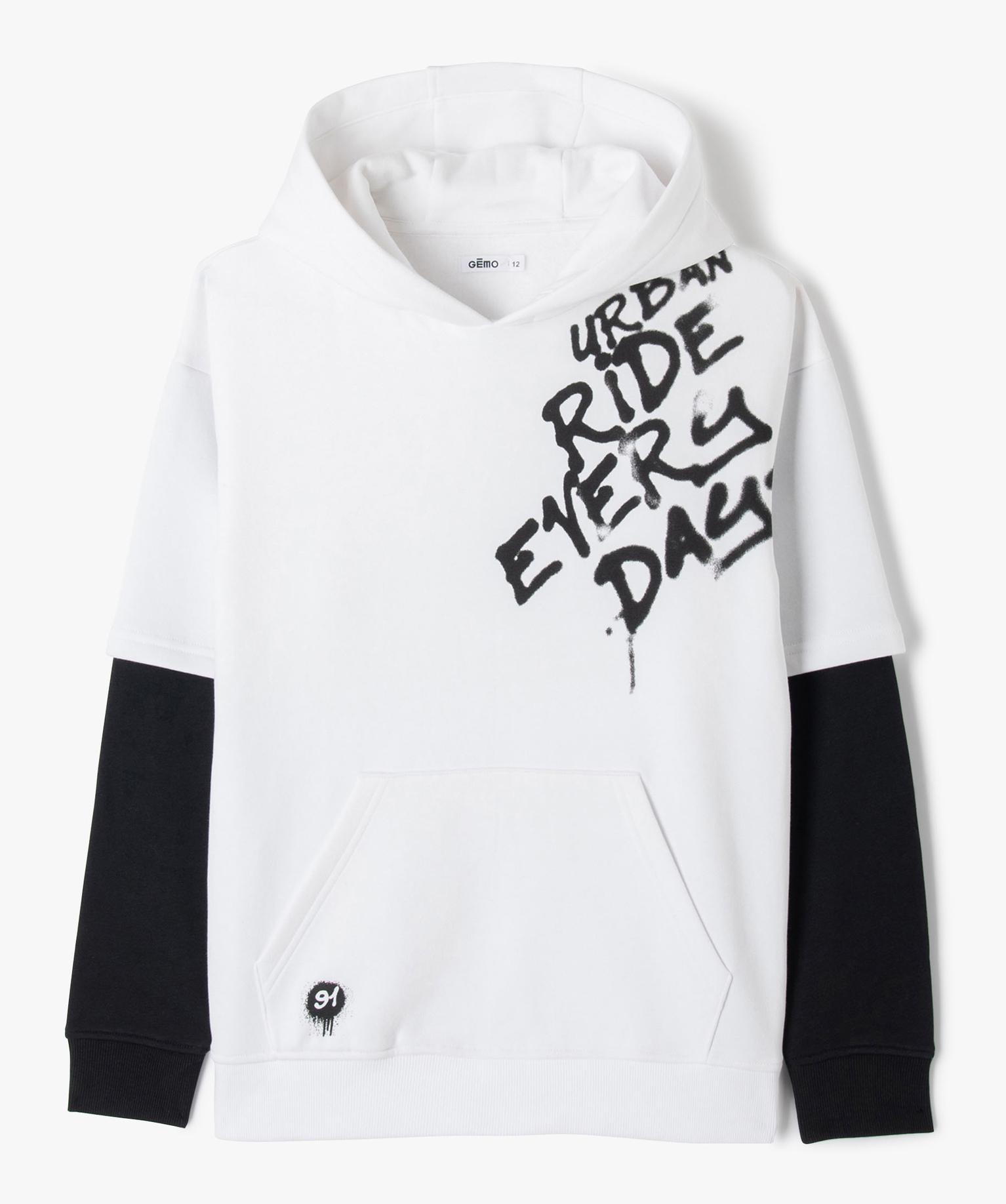 Un sweat à capuche spécialement imaginé pour les looks streetwear des ados. Agrémenté d’une inscription façon graffiti sur le buste, il affiche également un effet de superposition au niveau des manches. Ce sweat garçon offre beaucoup de confort grâce à son intérieur molletonné. Il possède une large poche kangourou et des finitions bord-côte aux poignets et dans le bas. Un sweat bicolore à associer à un jean large et des baskets.
