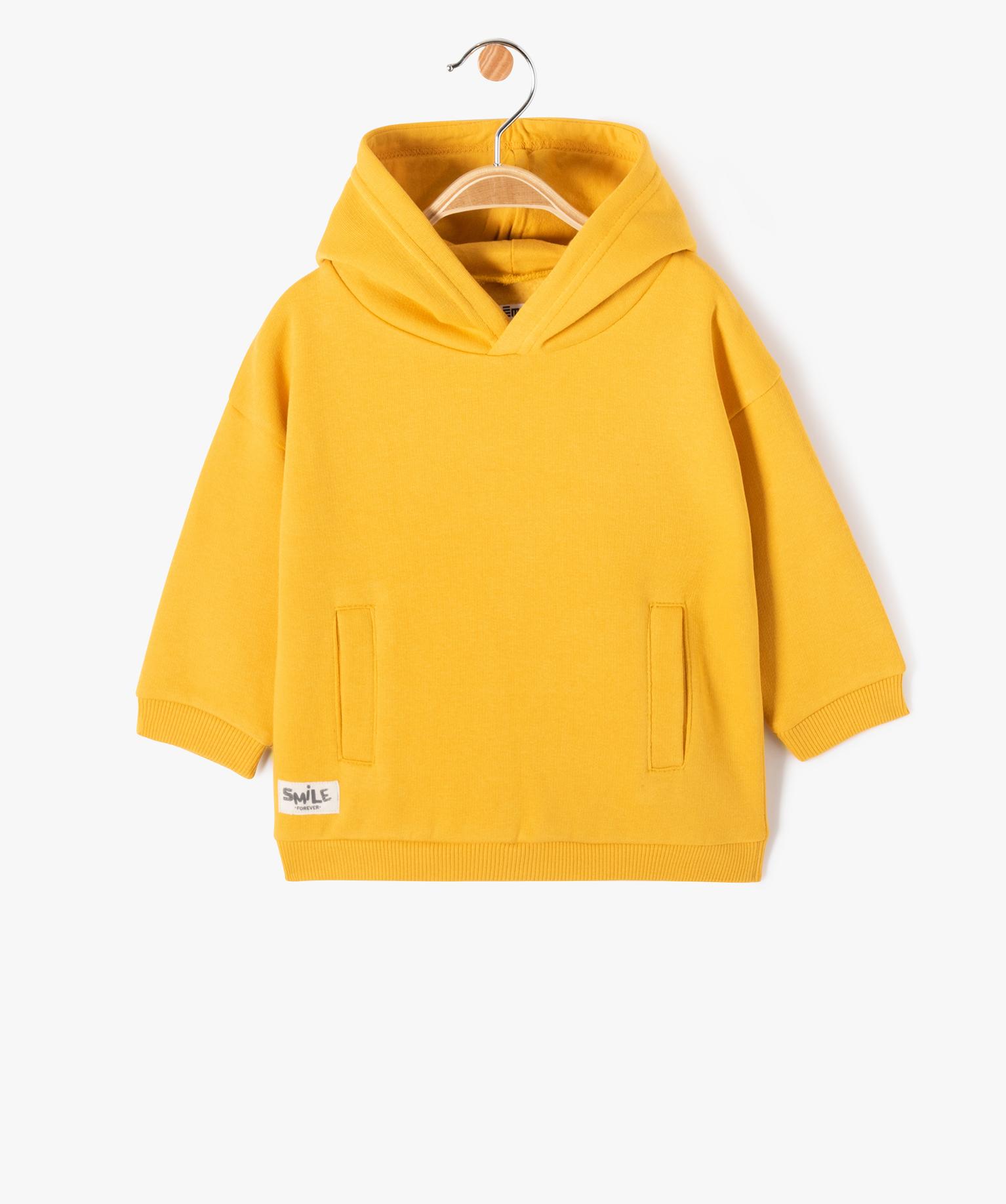 Simple et efficace, le sweat à capuche en molleton uni ! Ce sweat bébé garçon est tout doux à l'intérieur et sa capuche est doublée de jersey pour une jolie finition. Il possède deux poches raglan et une petite étiquette brodée dans le bas. Uni, il se marie facilement avec le reste du dressing de votre bambin. Finition bord-côte aux poignets et dans le bas.