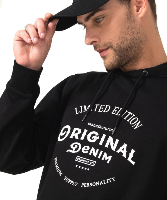 Craquez pour le confort de ce sweat à capuche en molleton gratté tout doux à l'intérieur ! Une pièce incontournable du vestiaire masculin qui réchauffe et rend cool tous vos looks en leur apportant une touche sportswear décontractée. Très simple, ce sweat homme sans poches et sans doublure à la capuche est simplement imprimé devant. Finitions en bord-côte. Cordon coulissant à la capuche avec embouts et œillets en métal. Dos uni. Capuche non doublée.