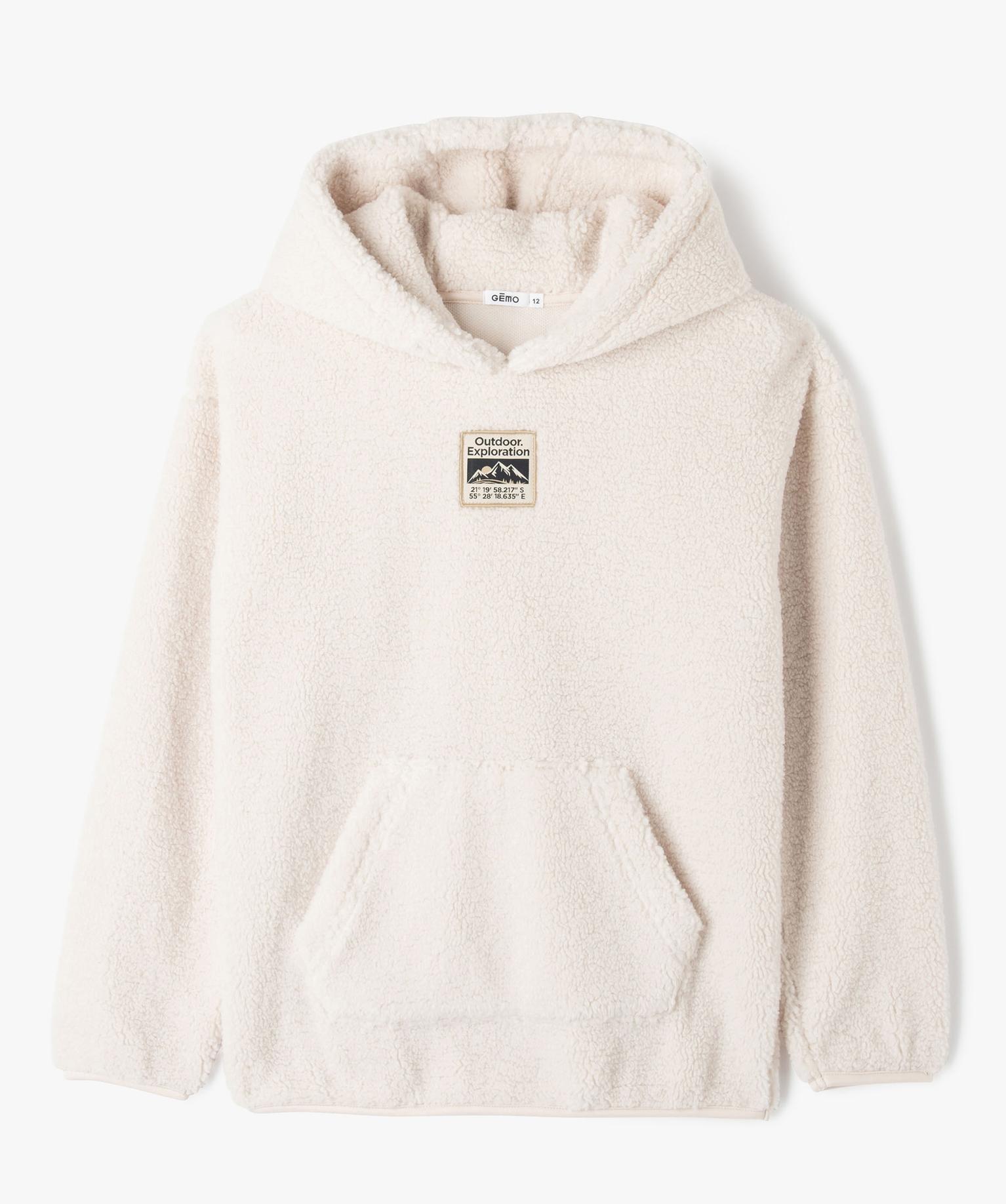 Vous allez adorer l’esprit outdoor de ce sweat à capuche en maille sherpa. Il affiche une coupe confortable et un look inspiré des grands espaces. Sur la poitrine, une étiquette brodée accentue son esprit aventurier. Ce sweat garçon possède une large poche kangourou et des finitions biais aux poignets et dans le bas. Un sweat chaud à porter avec un jean et des chaussures de randonnées pour les sorties trek.