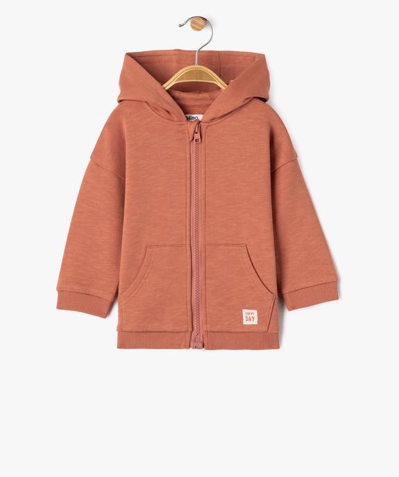 Indispensable des looks cool, le sweat zippé réchauffe toutes les tenues estivales. Il se porte fermé en mode sweat traditionnel ou ouvert sur un tee-shirt comme une veste. Ce sweat bébé garçon est confectionné dans une maille légère avec intérieur bouclette et possède une capuche doublée jersey. Fidèle aux codes du genre, il possède des poches façon kangourou et des finitions bord-côte aux poignets et dans le bas.