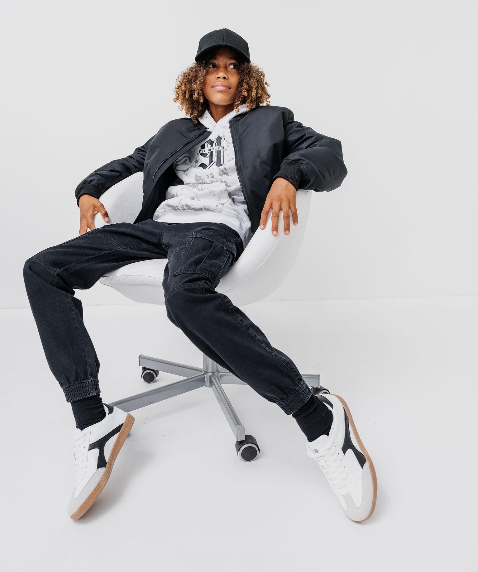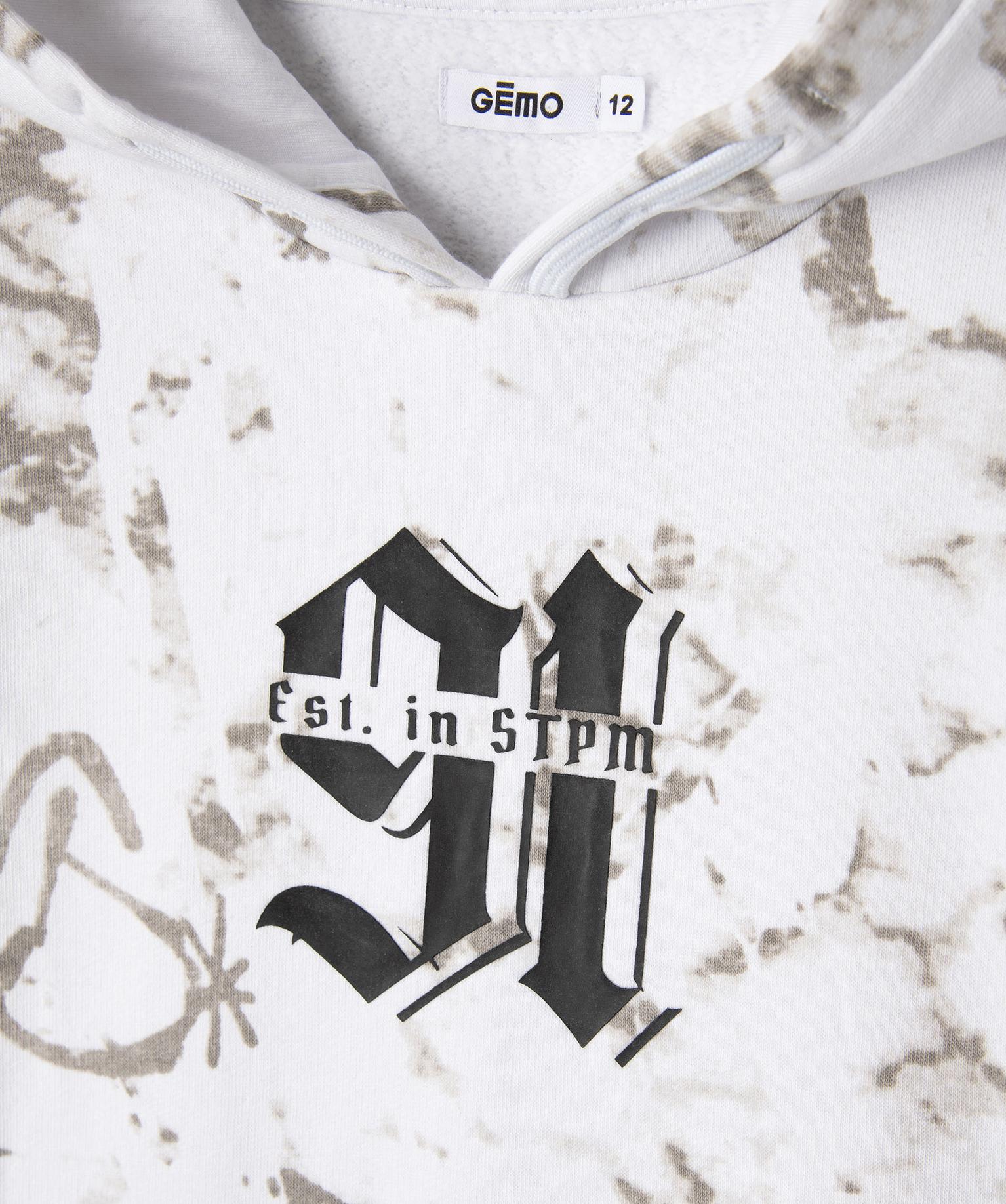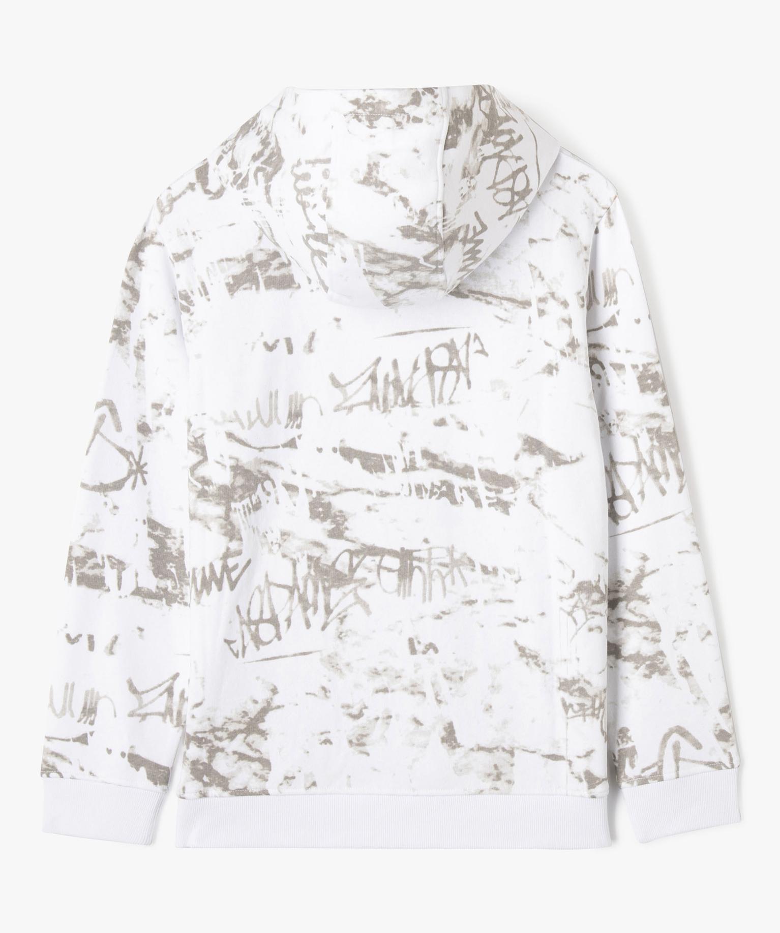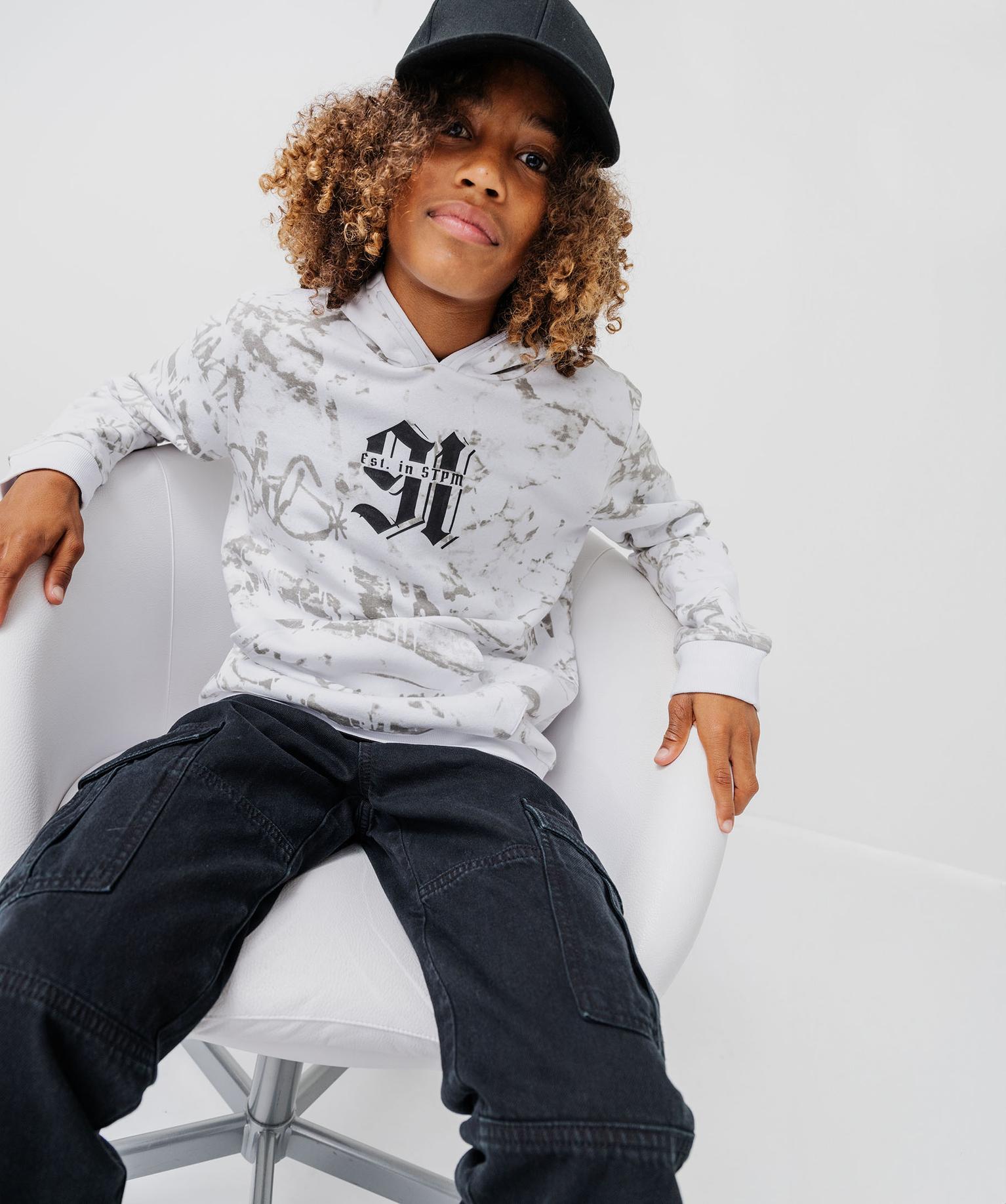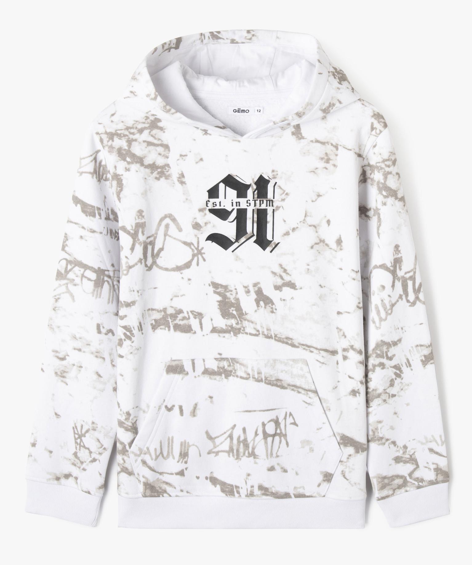 Basique du vestiaire streetwear, le sweat à capuche revient cette saison dans une version imprimée inspirée des graffitis. Un sweat garçon avec intérieur molletonné et finitions bord-côte dont la capuche est doublée de jersey. Confortable et terriblement tendance, ce sweat accompagnera les ados dans tous leurs looks décontractés. Poche kangourou.