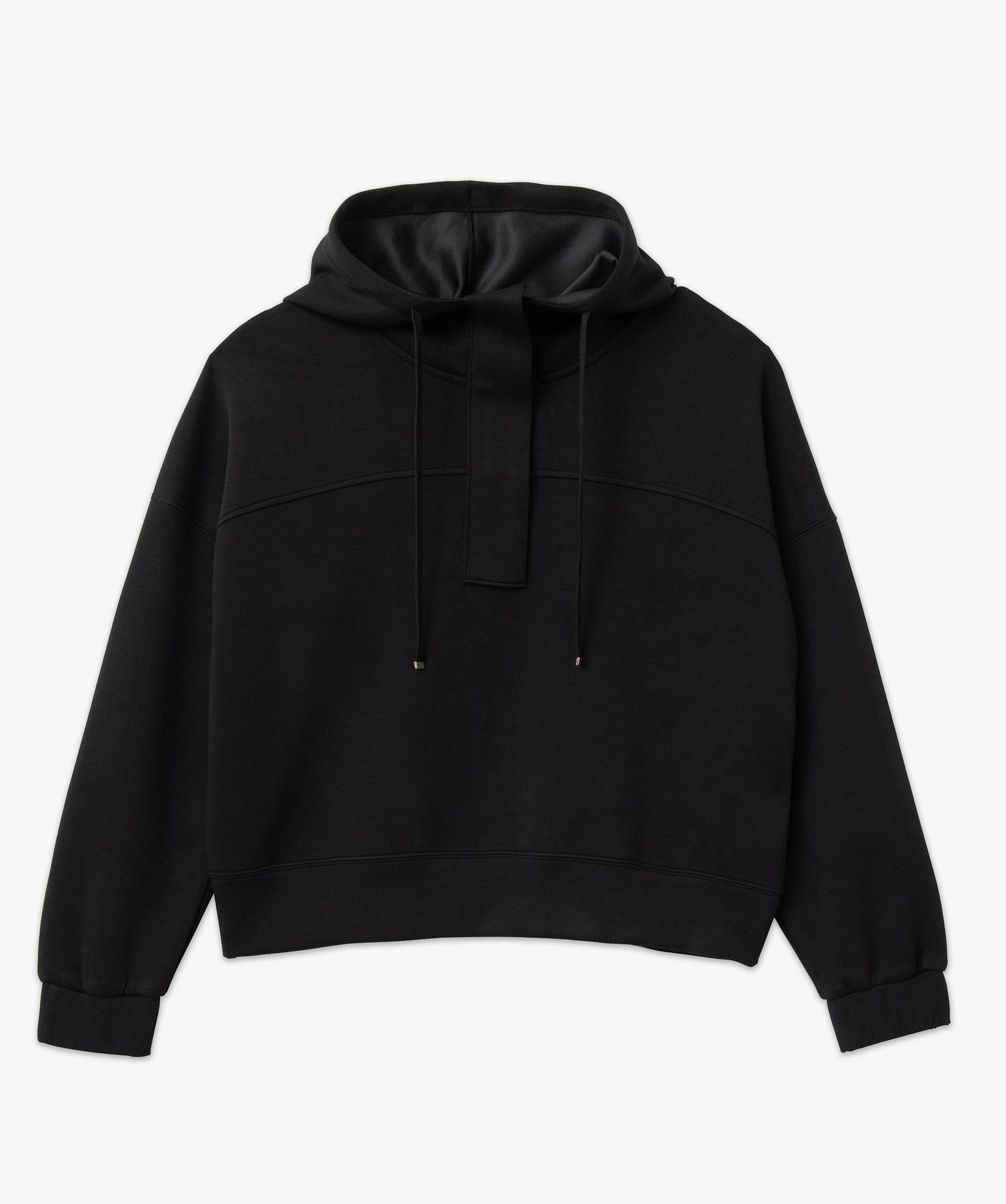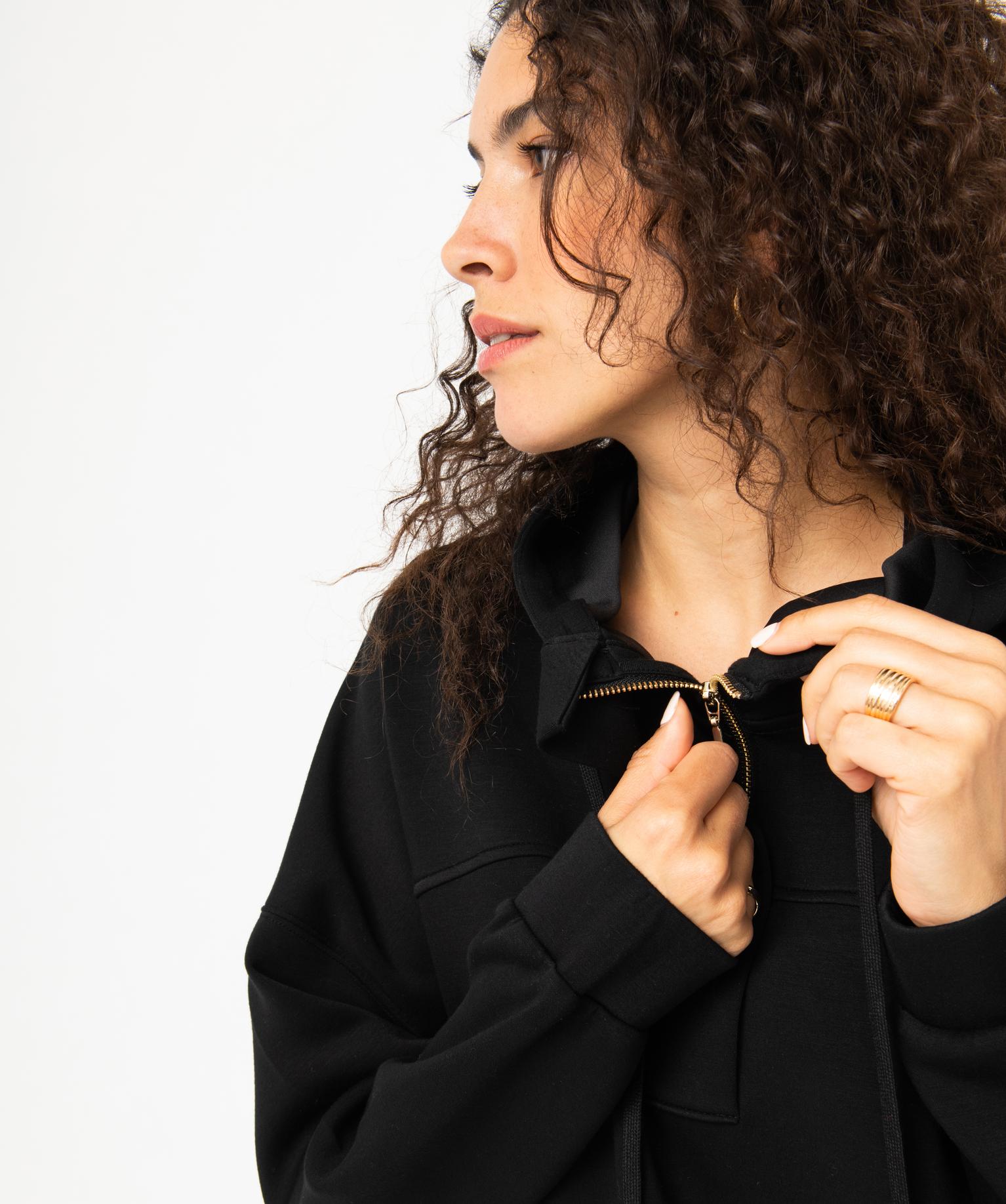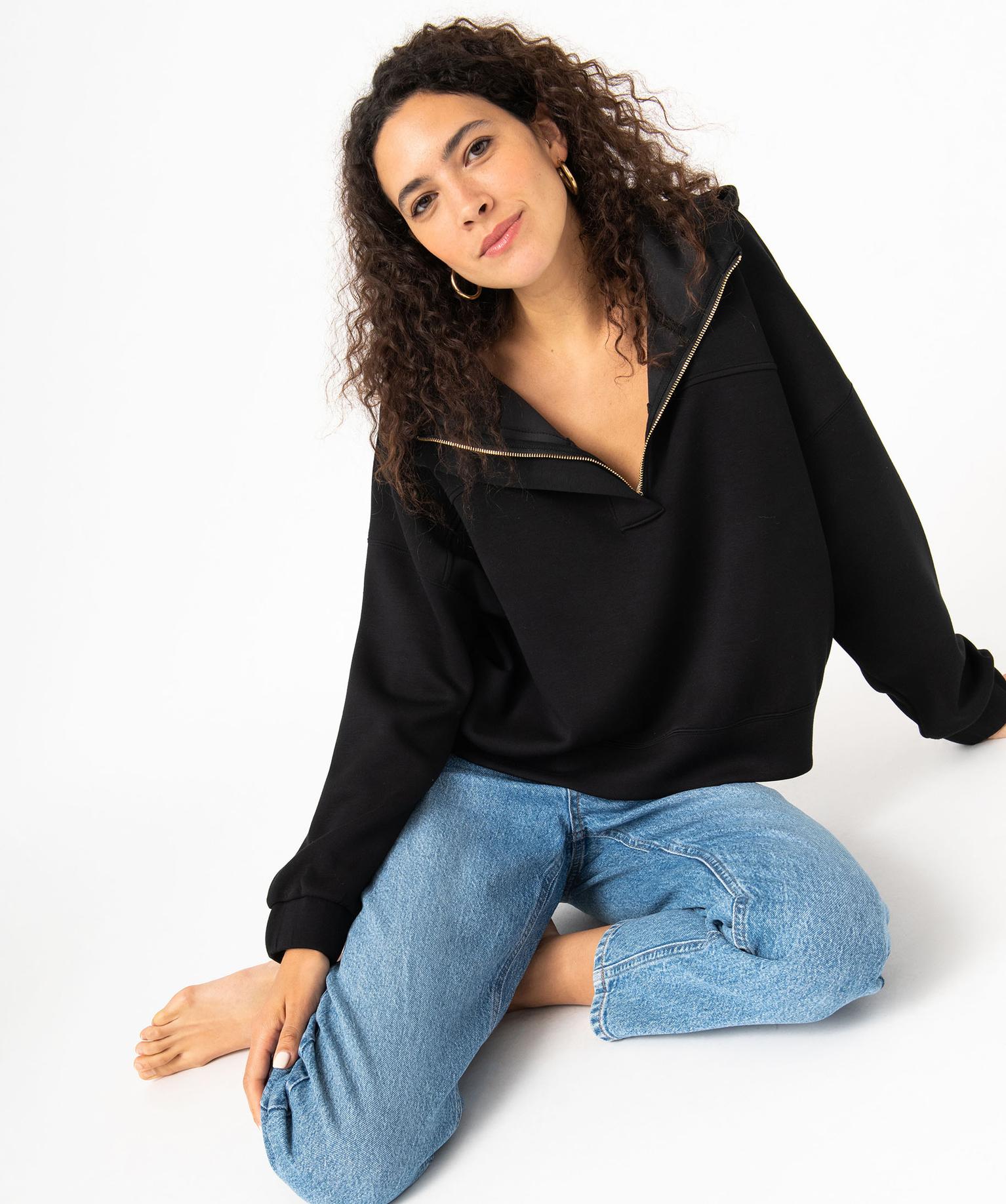 Gémo présente une version ultra tendance du sweat à capuche. Un sweat oversize et court, confectionné dans une matière fluide aux reflets légèrement irisés. Ce sweat femme possède un col montant zippé dont la fermeture est dissimulée sous une large patte de protection. Ce sweat affiche une coupe loose accentuée par des emmanchures tombantes et une surpiqûre arrondie sur le haut du buste. Une pièce originale à mixer avec un jean slim pour jouer les contrastes ou avec un leggings de sport. Capuche ajustable par cordon coulissant. Finitions larges biais dans le bas et élastiqués aux poignets.