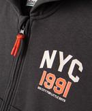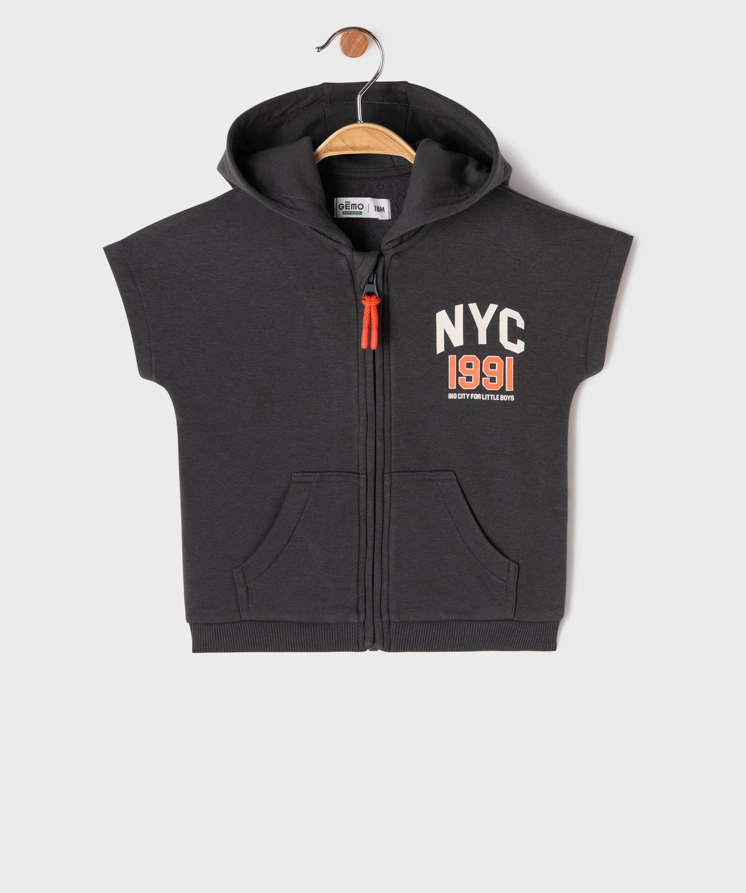 Gémo revisite un classique du vestiaire sportswear avec cette version sans manches du sweat à capuche. Un modèle original qui offre aux minis une allure totalement dans l’air du temps. Ce sweat sans manches bébé garçon est orné d’une inscription « New York » sur la poitrine, inspirée des maillots de basket, et possède deux poches façon kangourou. Un sweat zippé avec cordon fantaisie noué sur le zip. Grâce à son intérieur molletonné, il offre une douce chaleur réconfortante.