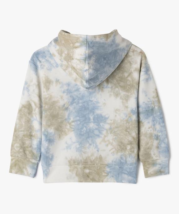 Gémo revisite le basique du vestiaire streetwear : retrouvez l'intemporel et superbe sweat à capuche imprimé façon tie and dye. Un sweat garçon très confortable grâce à son intérieur molletonné et sa coupe droite légèrement ample. Ce sweat accompagnera les ados dans tous leurs looks décontractés. Poche kangourou. Finition bord-côte. Capuche doublée jersey.