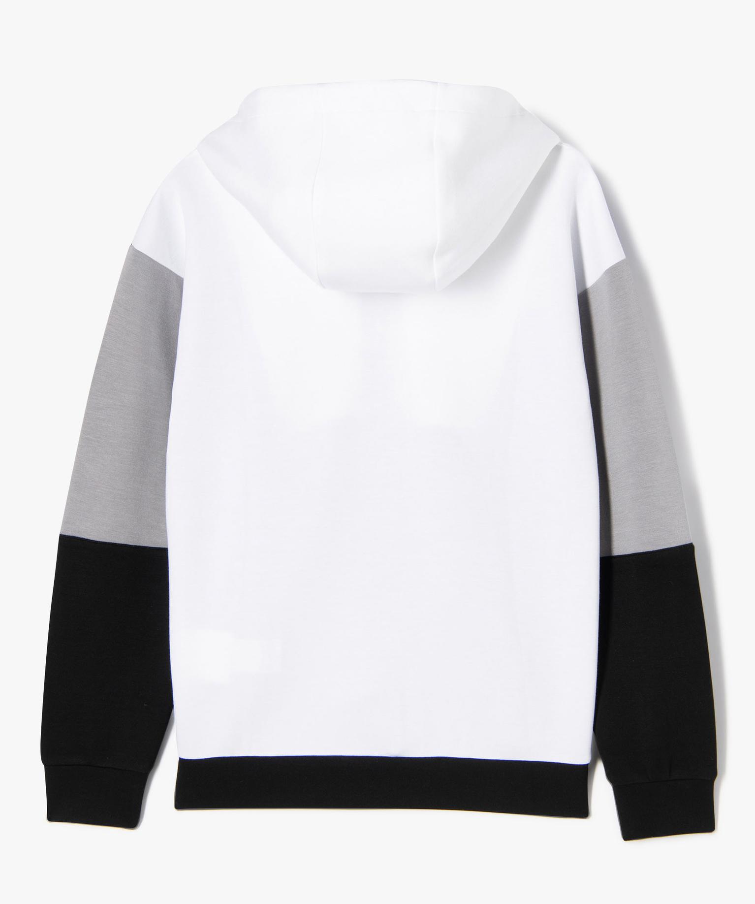 Le sweat zippé se présente ici dans une maille souple, légère et extensible, idéale pour le sport ou pour un style streetwear tendance. Ce sweat garçon multicolore possède une capuche doublée, décoré de cordons contrastants, de poches kangourous et se ferme à l'aide d'un zip. Un sweat à marier aussi bien avec un jean qu’avec un pantalon de jogging. Intérieur non molletonné.