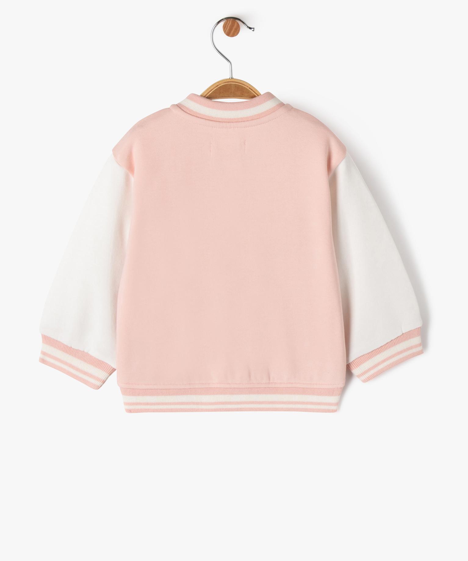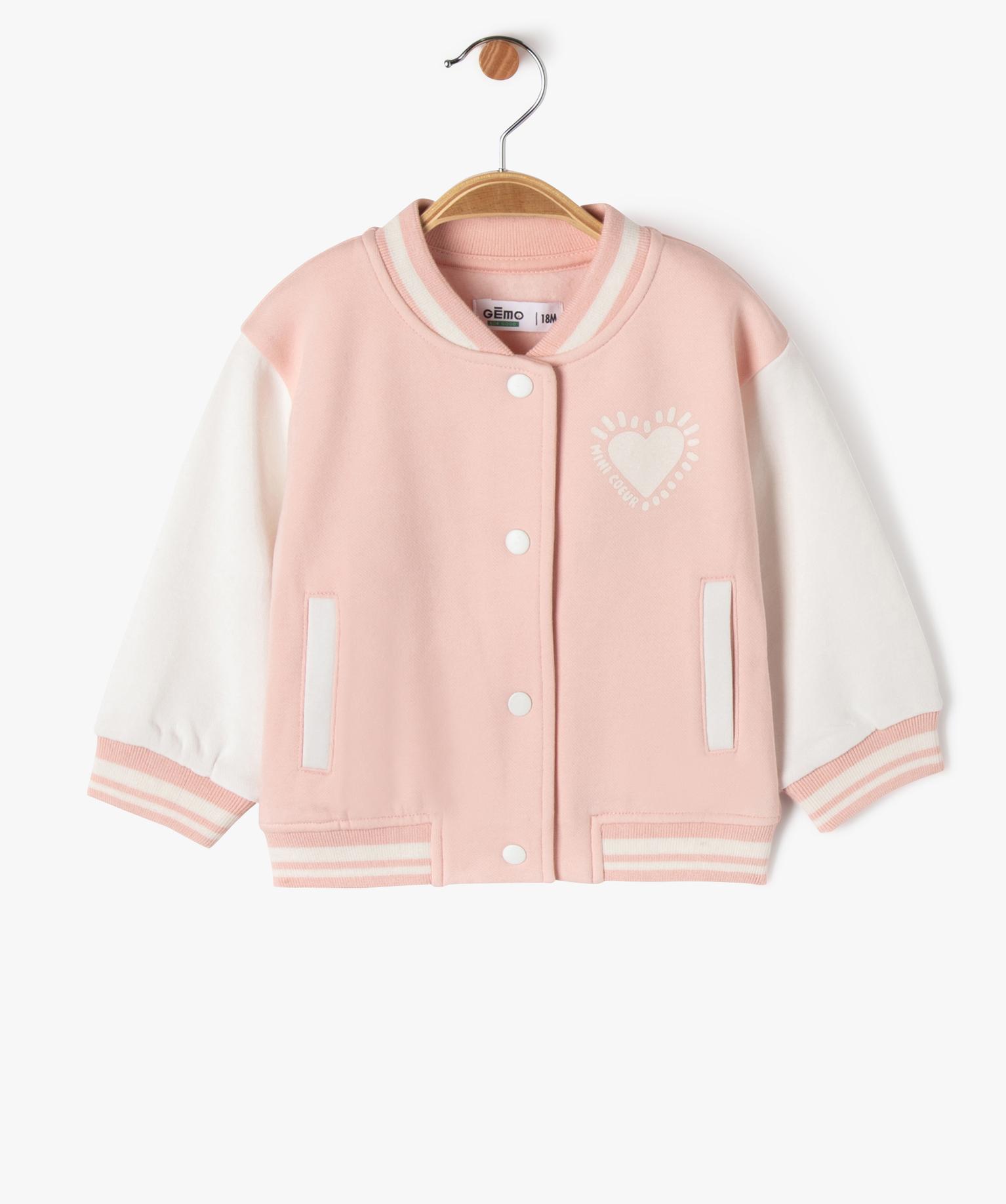 Must-have de tous les vestiaires sportswear, le sweat bicolore esprit Teddy se fait une place dans la garde-robe des petites filles. Décliné dans des teintes girly, il possède de jolies finitions en bord-côte bicolores sur le col, dans le bas et aux poignets. Ce sweat bébé fille est agrémenté d’un motif coeur scintillant sur la poitrine, ajoutant une touche de charme. Il possède un intérieur molletonné doux et chaud et se ferme facilement à l’aide de boutons pression. Un sweat à intégrer dans tous les looks décontractés et à porter comme blouson à l’intersaison. Deux poches raglan sur l’avant.