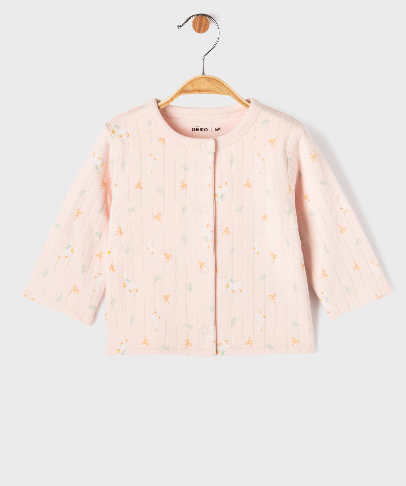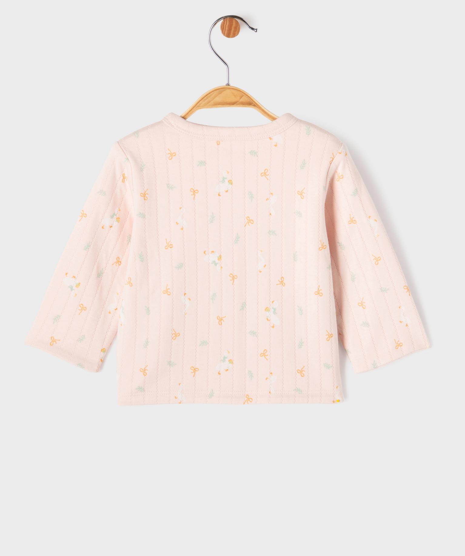 Enveloppez votre petite fille de douceur avec cet élégant sweat en coton fermé par des boutons pression. Un modèle plein de charme rehaussé de fines rayures en maille fantaisie, de petits canards et de rubans. Un sweat bébé fille, entièrement doublé, facile à enfiler, que les petites princesses pourront porter fermé comme un pull ou ouvert sur un tee-shirt.