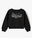 Le sweat fille s’affiche dans une version ample et courte, pile dans la tendance des crop tops ! Un sweat fabriqué en molleton doux, mais pas trop épais pour permettre les superpositions et un porter tout au long de l'année ! Le sweat aux manches tombantes est décoré devant et dos d'inscriptions brillants en rapport avec la danse. Top comme tenue de sport pour s'échauffer Col rond, base et poignets en bord-côte.