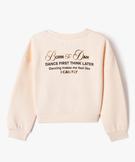 Le sweat fille s’affiche dans une version ample et courte, pile dans la tendance des crop tops ! Un sweat fabriqué en molleton doux, mais pas trop épais pour permettre les superpositions et un porter tout au long de l'année ! Le sweat aux manches tombantes est décoré devant et dos d'inscriptions brillants en rapport avec la danse. Top comme tenue de sport pour s'échauffer Col rond, base et poignets en bord-côte.