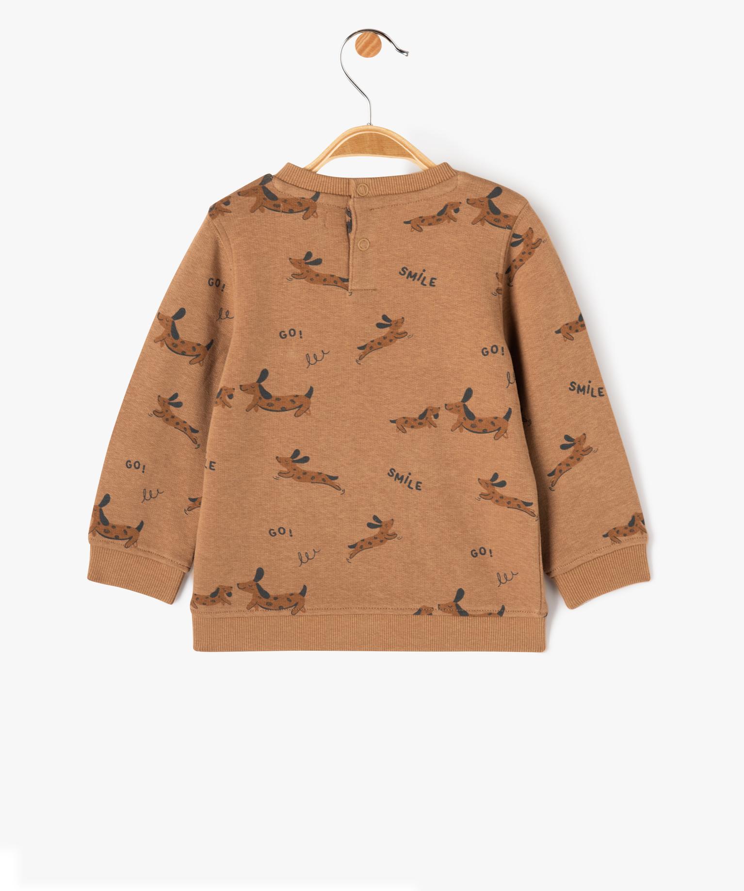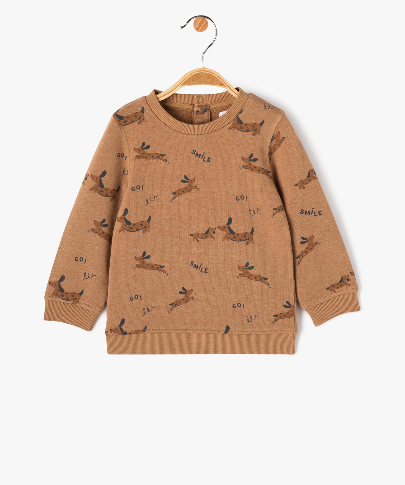 L'incontournable sweat se décline ici en version bébé garçon. Un modèle souple et léger idéal pour l'intersaison ou avec un tee-shirt à manches longues dessous. Le pull en maille bouclette est décoré d'un motif chien adorable. Sa coupe est aussi confortable que sa matière. Pour l'habillage, pas de souci non plus grâce aux 2 boutons pression dans le dos qui permettent d'élargir l'encolure. Finition bord-côte uni au col, aux poignets et dans le bas.