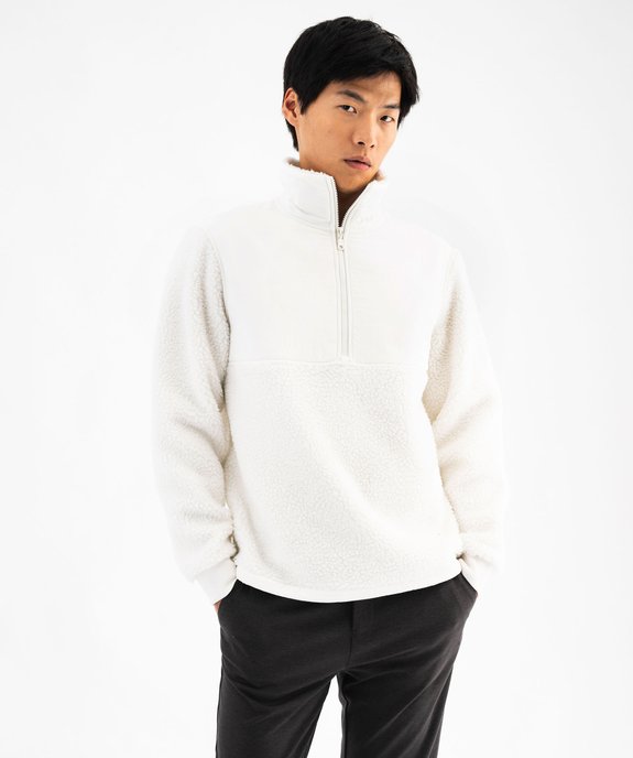 Ce joli sweat pour homme vous promet une maximum de chaleur grâce à sa confection en sherpa et son intérieur en maille polaire. Il se démarque par un empiècement en toile ton sur ton sur la partie haute du buste, le col et les épaules. Ce sweat bi-matières s’enfile facilement grâce à son col camionneur muni d’un grand zip. Pratique, il possède un cordon coulissant dans le bas avec stop-cordons sur les côtés, qui permet de le resserrer à la base. Un sweat chaud à porter avec tous les pantalons du vestiaire. Poignets resserrés par un bord-côte.