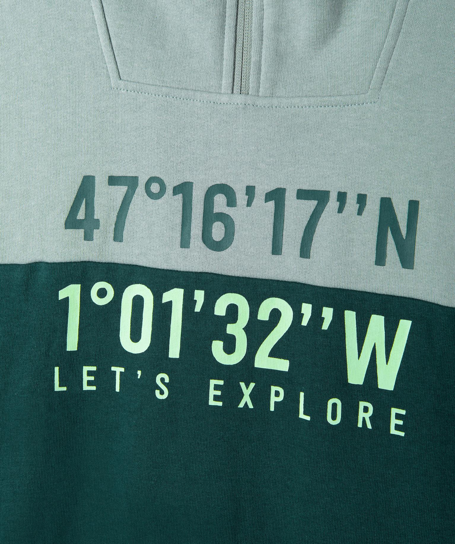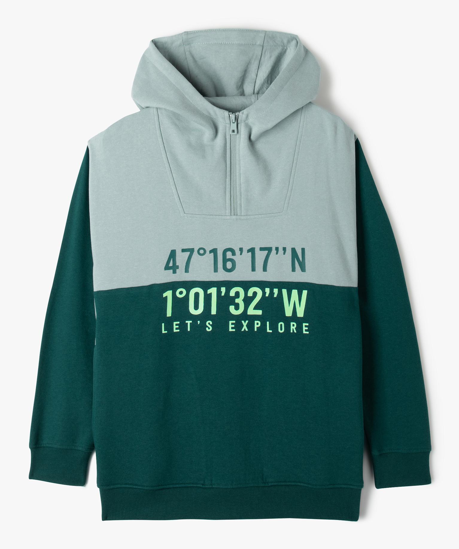 Les ados ne quitteront plus ce sweat à capuche en molleton doux. En total look sportswear avec un pantalon de jogging, il offre aussi un look casual travaillé avec un jean et des baskets montantes. L'atout charme de ce sweat pour garçon ? Son col zippé avec surpiqûres façon plastron, ainsi que ses empiècements contrastants. Motif sur l'avant. Finition bord-côte aux poignets et dans le bas. Poches dissimulées dans les coutures latérales. Capuche doublée jersey. Dos uni.