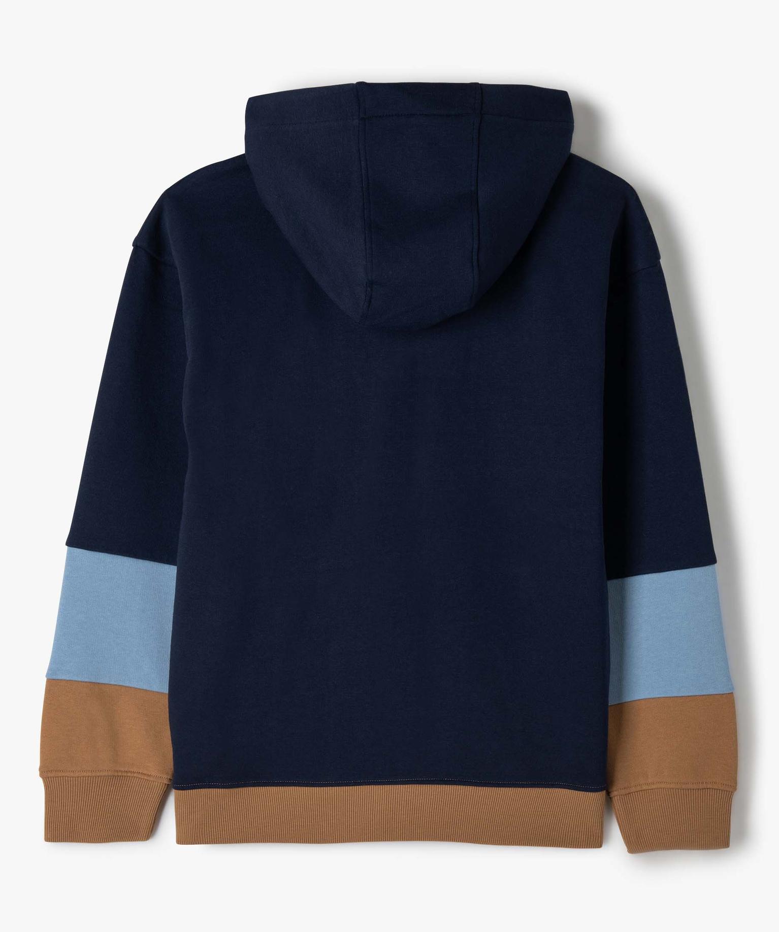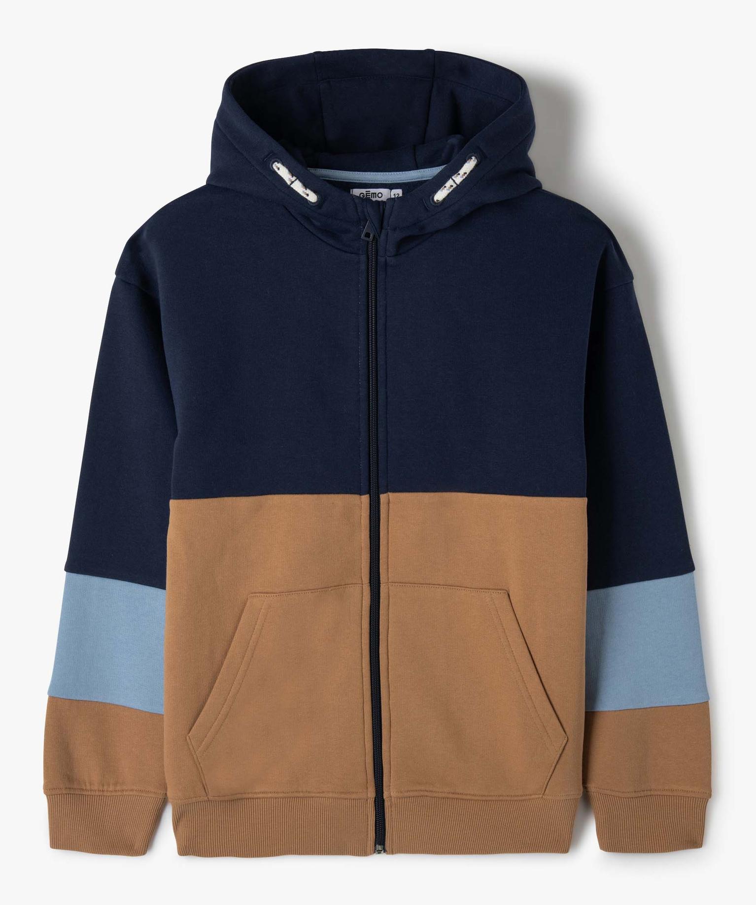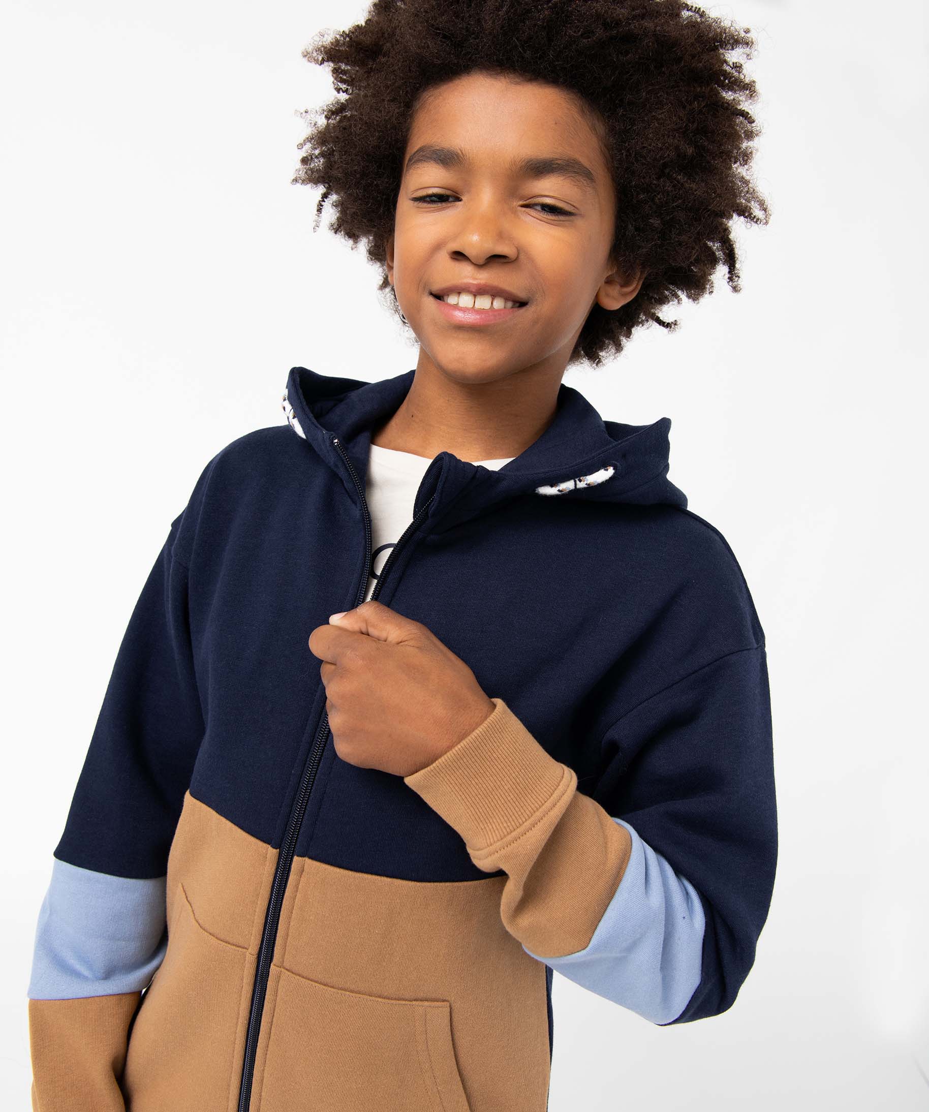 Indispensable du vestiaire des ados, le sweat zippé à capuche s’affiche dans une version tricolore pour apporter encore plus de style aux tenues sportswear. Un sweat garçon avec intérieur molletonné très confortable, qui reste fidèle aux codes avec ses finitions bord-côte, ses poches façon kangourou et sa capuche doublée. Il est agrémenté de petits cordons fantaisie à la base de la capuche. Un sweat tricolore à porter avec un pantalon de jogging uni et une paire de baskets.