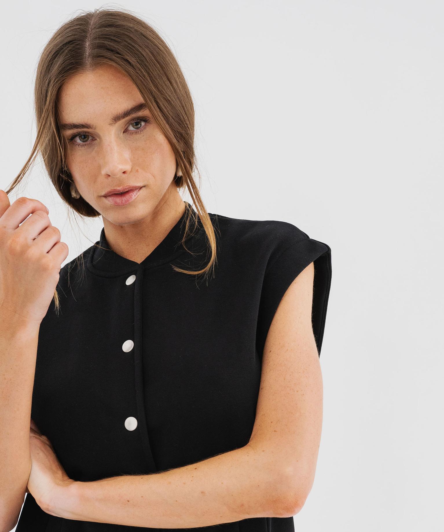 Gémo dévoile une version inédite du sweat pour femme à porter seul ou à positionner sur un tee-shirt à manches longues. Un sweat sans manches doté de larges emmanchures soulignées par un biais. Il se ferme par une rangée de boutons pression en métal et possède deux poches raglan sur l’avant. Un sweat avec intérieur molletonné idéal pour réchauffer les looks de l’intersaison avec un maximum de style.