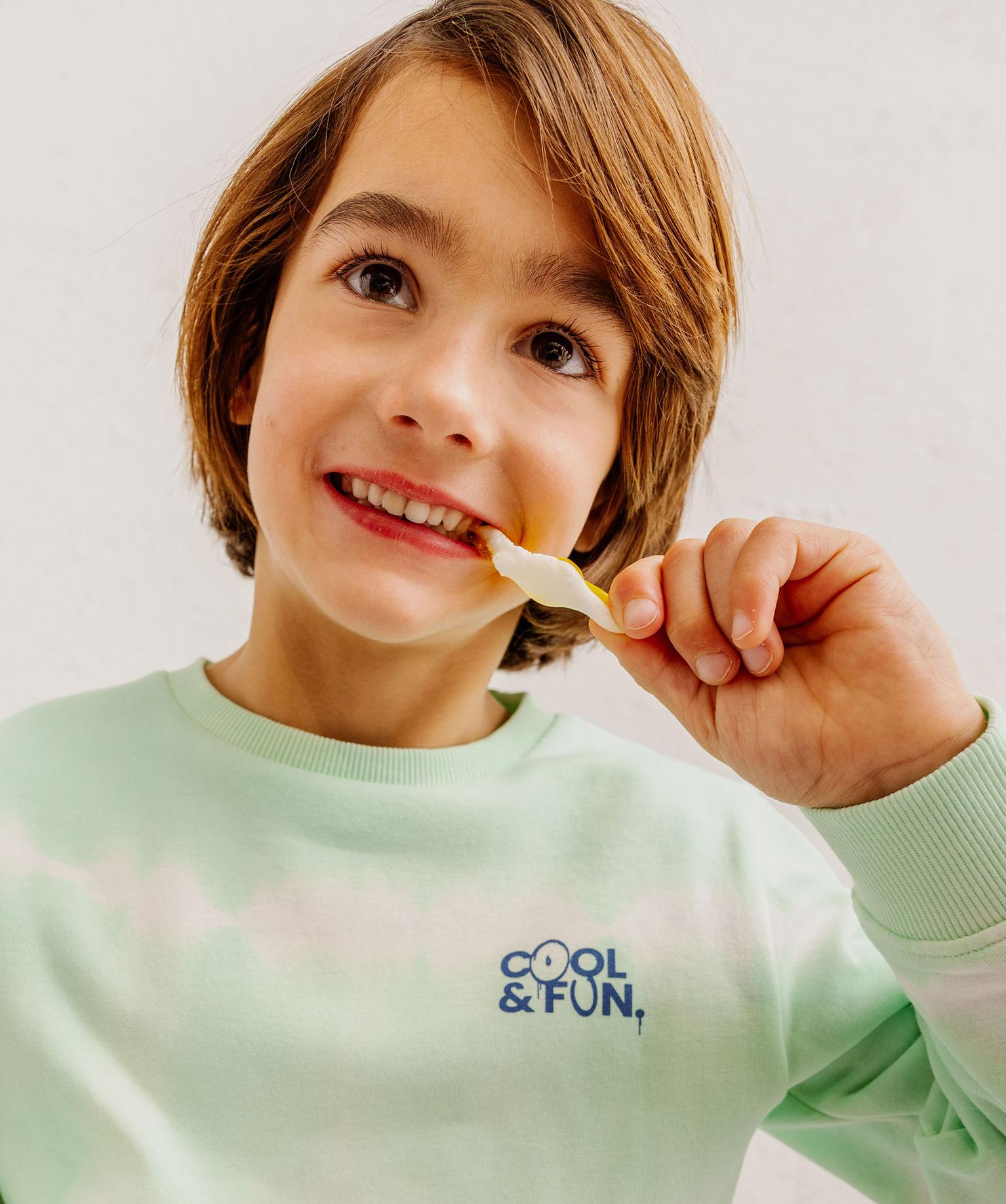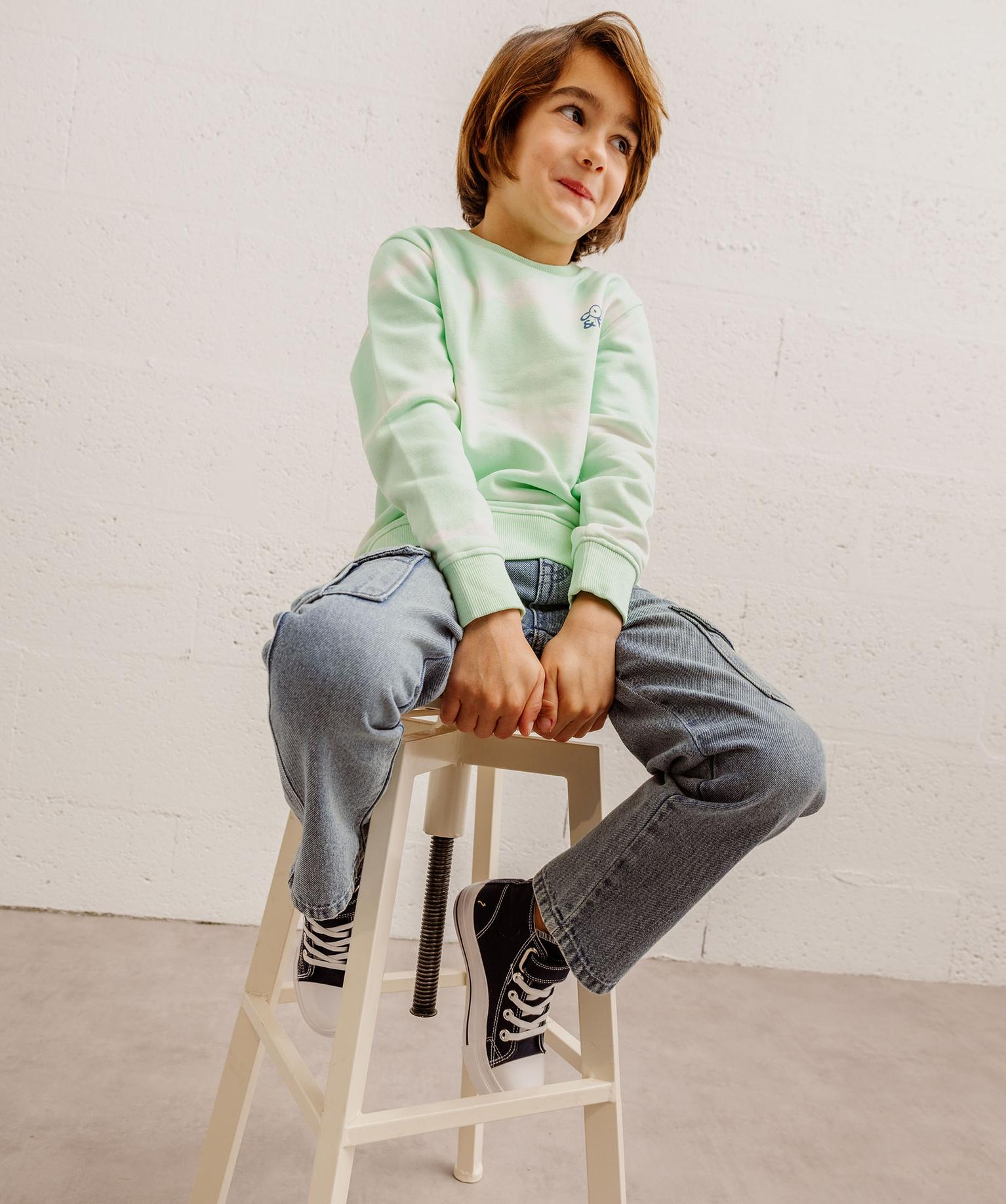 Super cool le sweat garçon avec son coloris tie-and-dye rafraichissant et tendance ! Un sweat à la coupe toute simple, facile à assortir, mais qui sort du lot. Il apportera moelleux, confort et beaucoup de style à votre enfant. Le sweat est fabriqué en molleton gratté, doux et chaud. Il possède une finition bord-côte uni au col, aux poignets et dans le bas. Sur la poitrine figure un petit imprimé. Une pièce essentielle du dressing à combiner aussi bien avec un jean qu'avec un jogging.