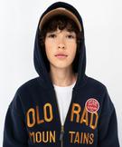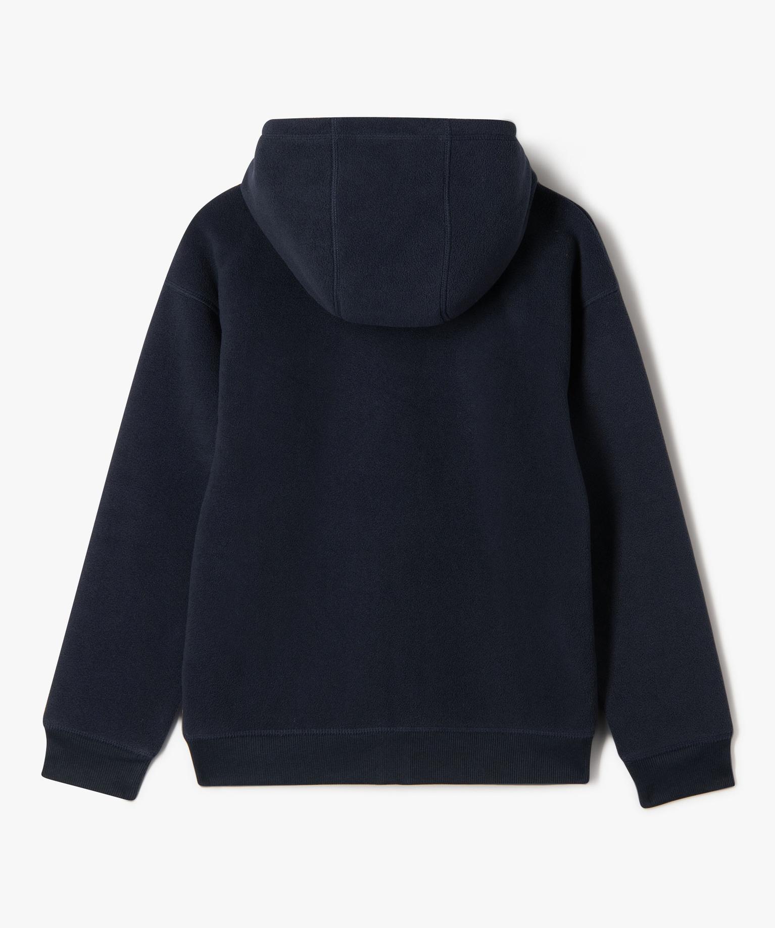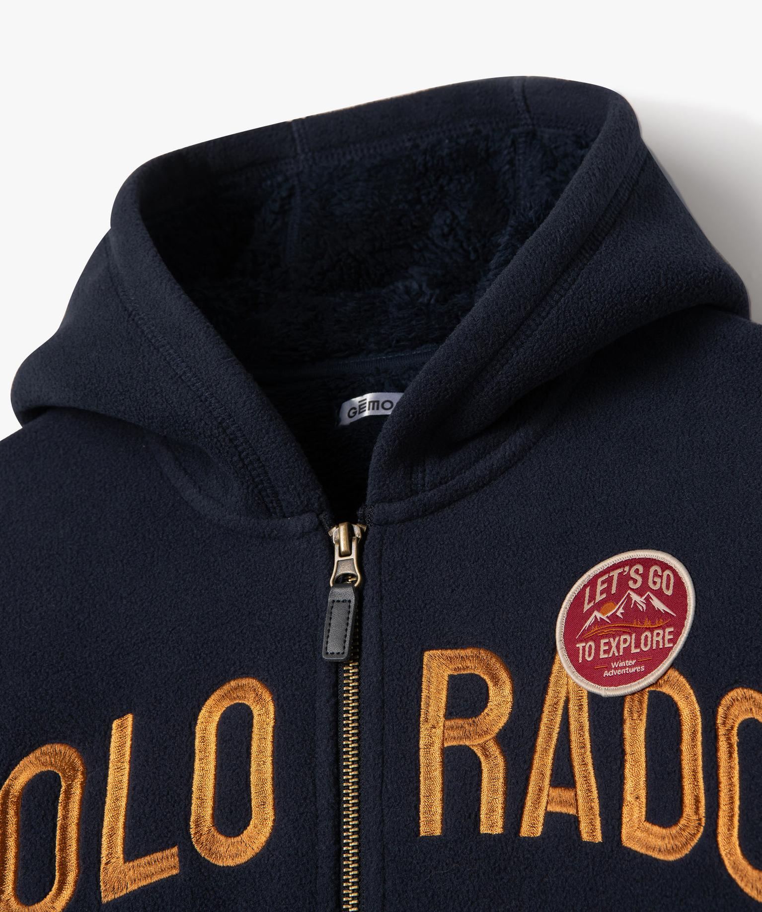 Un magnifique sweat zippé spécialement conçu pour les jeunes aventuriers. Il est orné d’une large inscription brodée et d’un macaron sur le buste. Ce sweat garçon est confectionné en maille polaire et entièrement doublé de sherpa, jusqu’à l’intérieur de la capuche, pour offrir encore plus de chaleur et un confort exceptionnel. Il possède deux poches et des finitions en bord-côte aux poignets et dans le bas. Un sweat à porter comme une veste à l’intersaison, avec un jean et des boots.