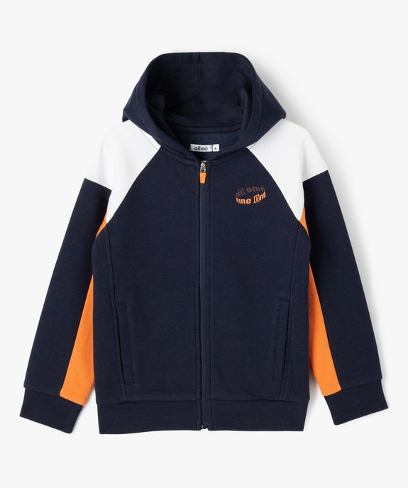 En molleton doux, ce sweat garçon est parfait pour la saison ! Il réchauffe votre bambin entre deux activités sportives ou lui donne un style tendance au quotidien. Ce sweat se ferme à l'aide d'un zip fantaisie au niveau de la tirette. Il possède une capuche doublée de jersey et 2 poches. Vous apprécierez son look multicolore original. Finition bord-côte aux poignets et dans le bas. Inscription poitrine. Dos uni.