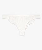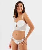 Élégant tanga femme. Le tanga est confectionné dans une dentelle moderne et féminine qui joue la carte de la transparence sur les côtés et l'arrière. Devant, la pièce de lingerie est doublée. La ceinture élastique et l'entrejambe sont en satin. Le tanga possède une ouverture dans le dos, sous la ceinture, avec un jeu de liens et de bijoux dorés. Un tanga sexy à porter avec le bustier ou un soutien-gorge assorti.
