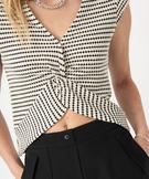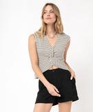 Pour un été pétillant, optez pour cette version originale du tee-shirt à manches courtes. Un tee-shirt femme confectionné dans une maille texturée effet gaufré. Il se distingue non seulement par sa matière bicolore effet graphique, mais aussi par sa coupe atypique qui sublime le dos : décolleté en V, effet noué et découpes qui dévoilent le bas du dos. Un tee-shirt à col rond qui saura mettre la silhouette en valeur avec style. Il se porte avec un pantalon taille haute et des sandales à talon.