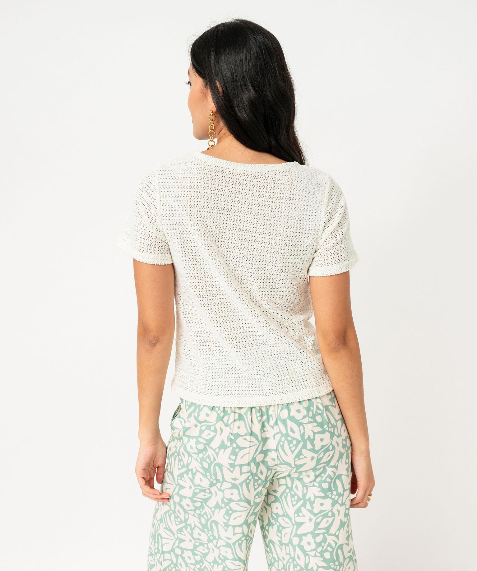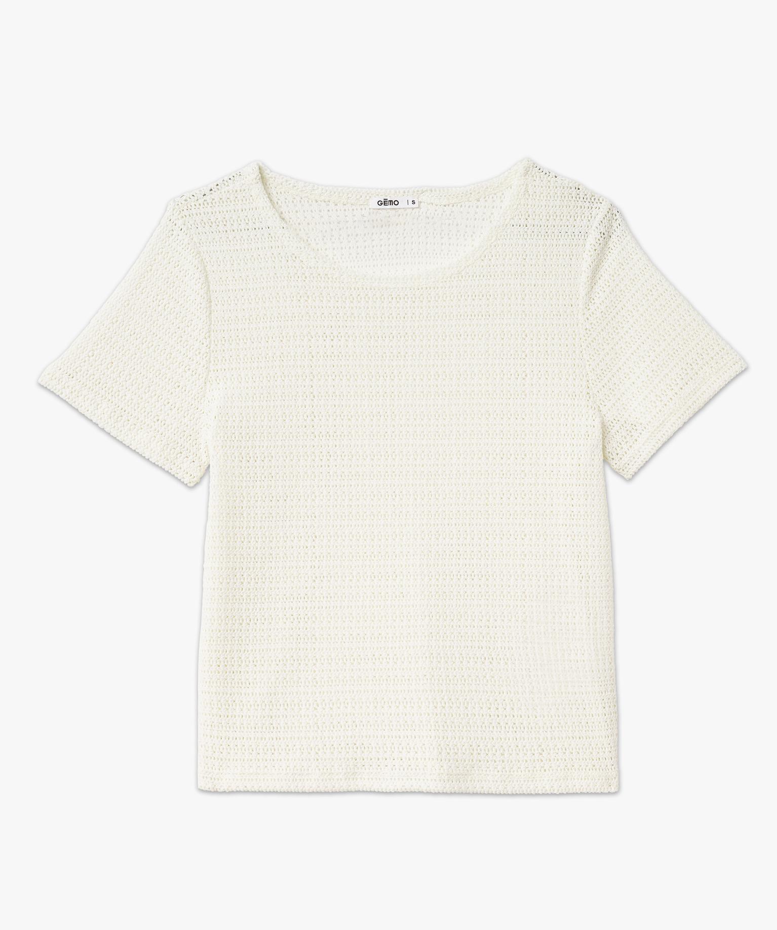 Tee-shirt à manches courtes en maille ajourée esprit crochet femme blanc chine